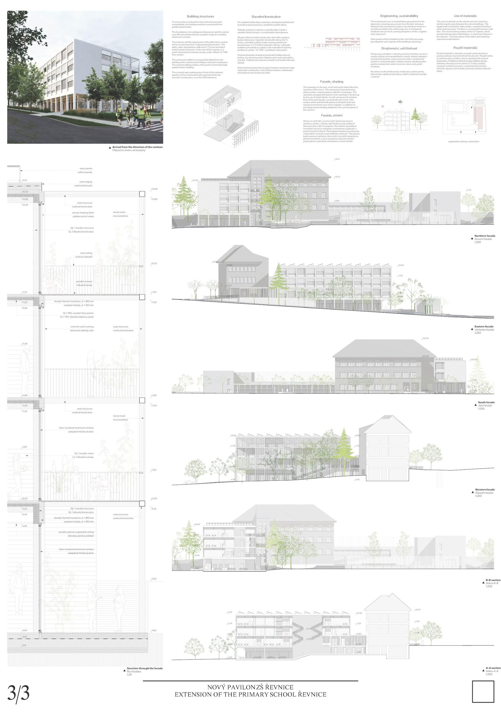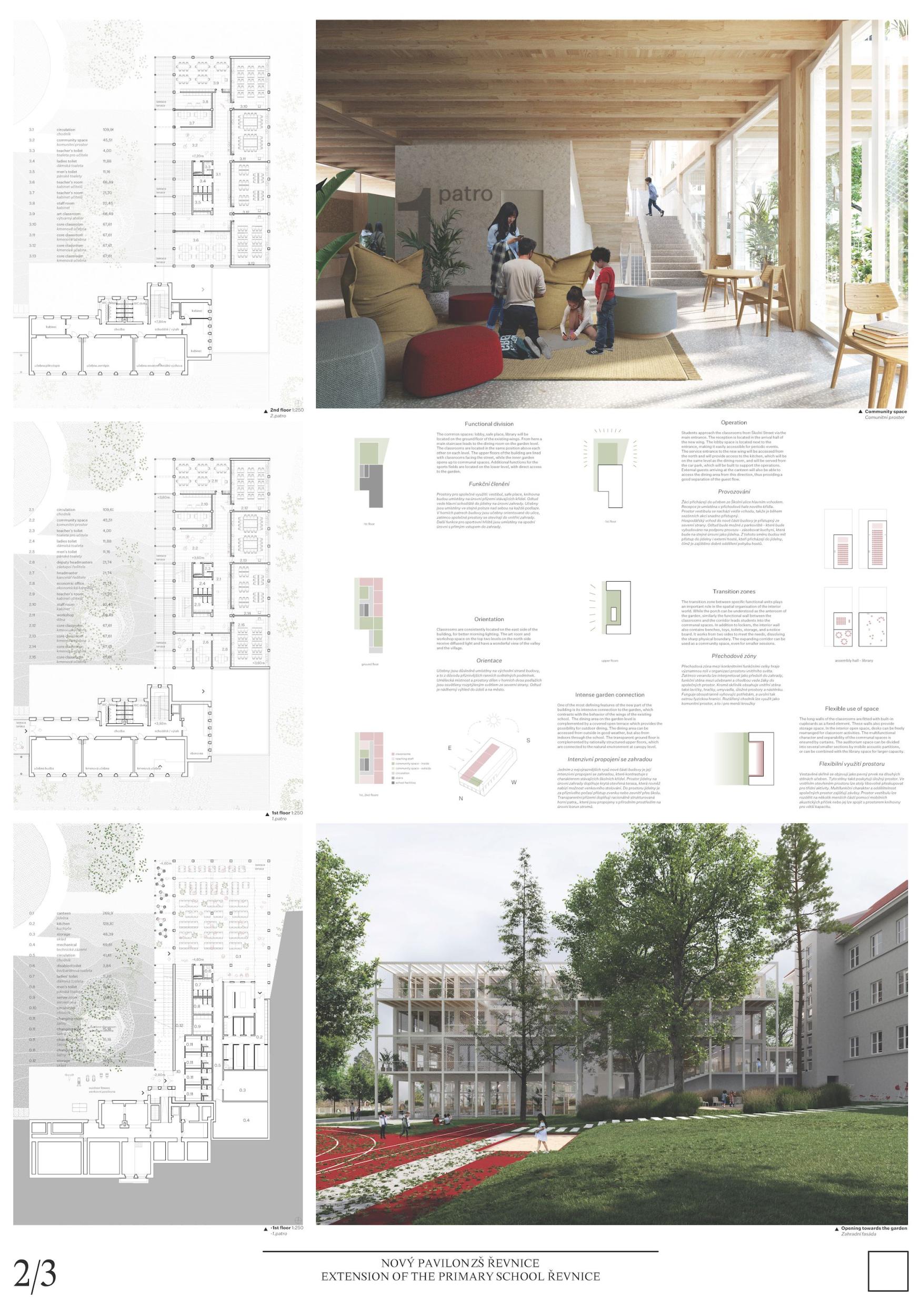 Návrh elegantně řeší několik problémů předložených v rámci soutěžního zadání a účinně integruje zahradu a přilehlé veřejné prostory, proto mu porota udělila první cenu. Příchodová sekvence je pečlivě promyšlená s ohledem na propojení s existující budovou školy a umístěním sálu vedle nového vstupu. Dispozice umožňuje vytvoření prostorů mimo třídy pro výuku mimo tradiční prostředí. Přítomnost balkónů pak poskytuje další venkovní prostory, což je v době po pandemii Covid‐19 velmi žádoucí. Bude ovšem nezbytné provést rozpočtové a technické posouzení, které se zaměří na možné přehřívání východně orientovaných učeben.