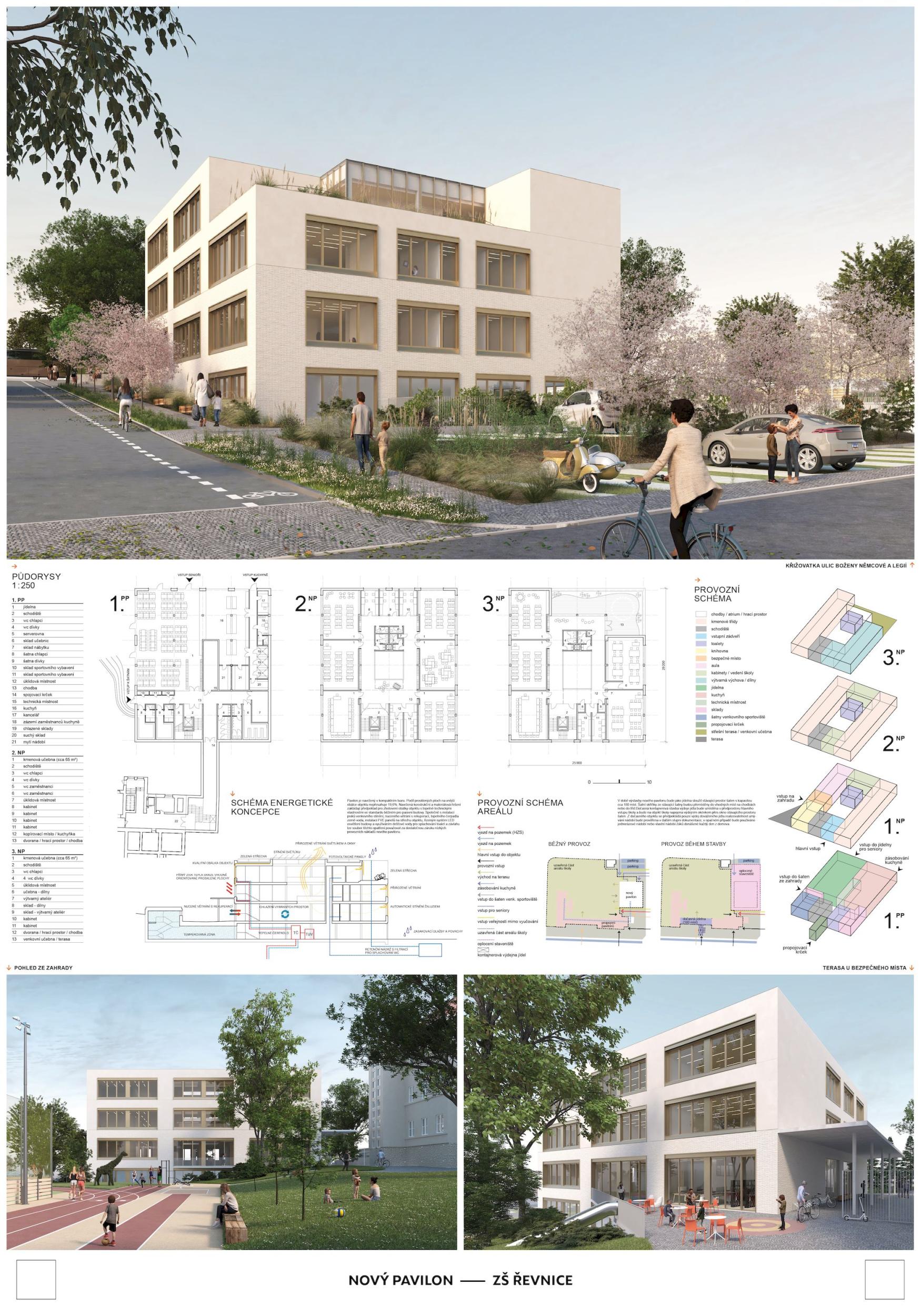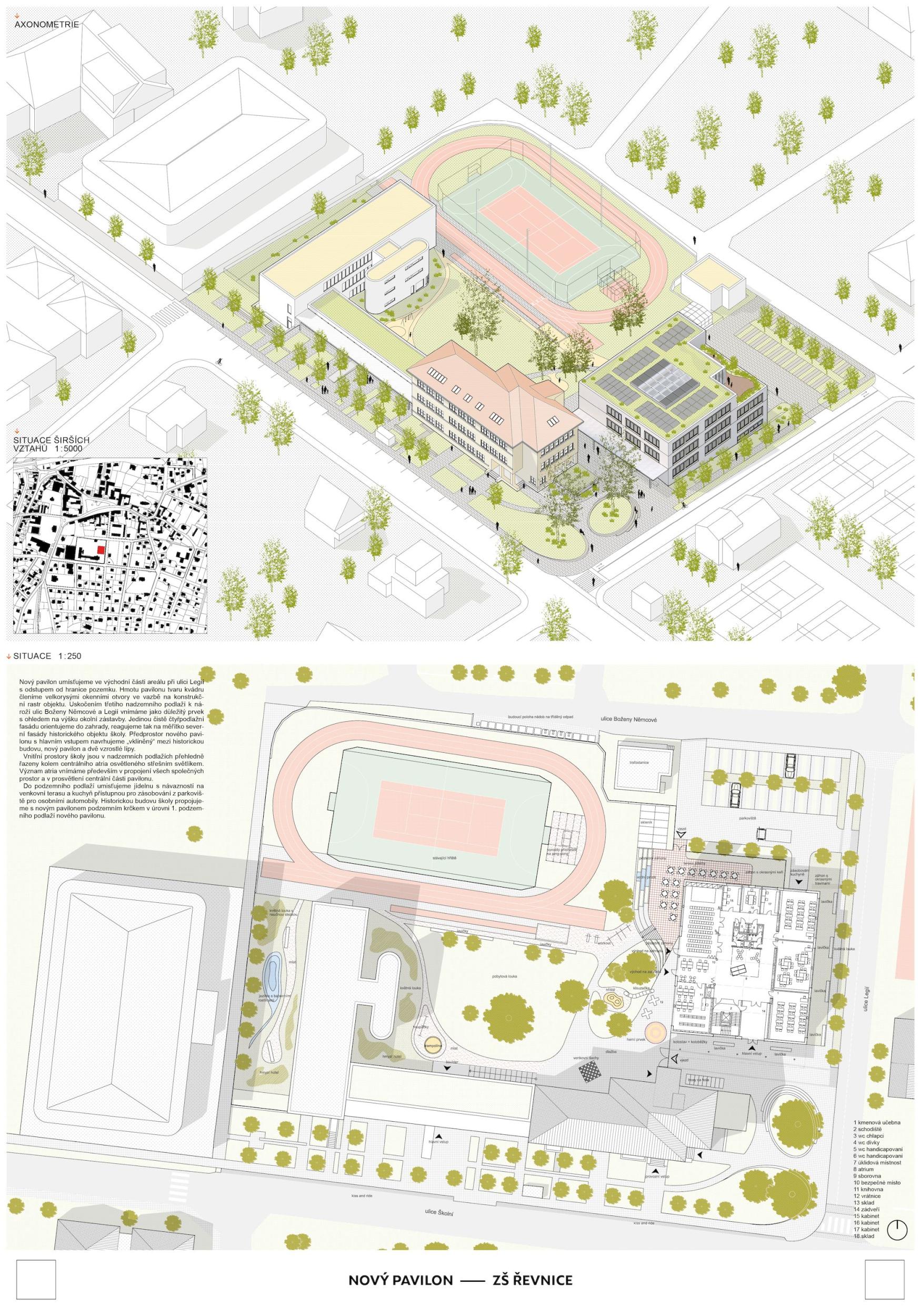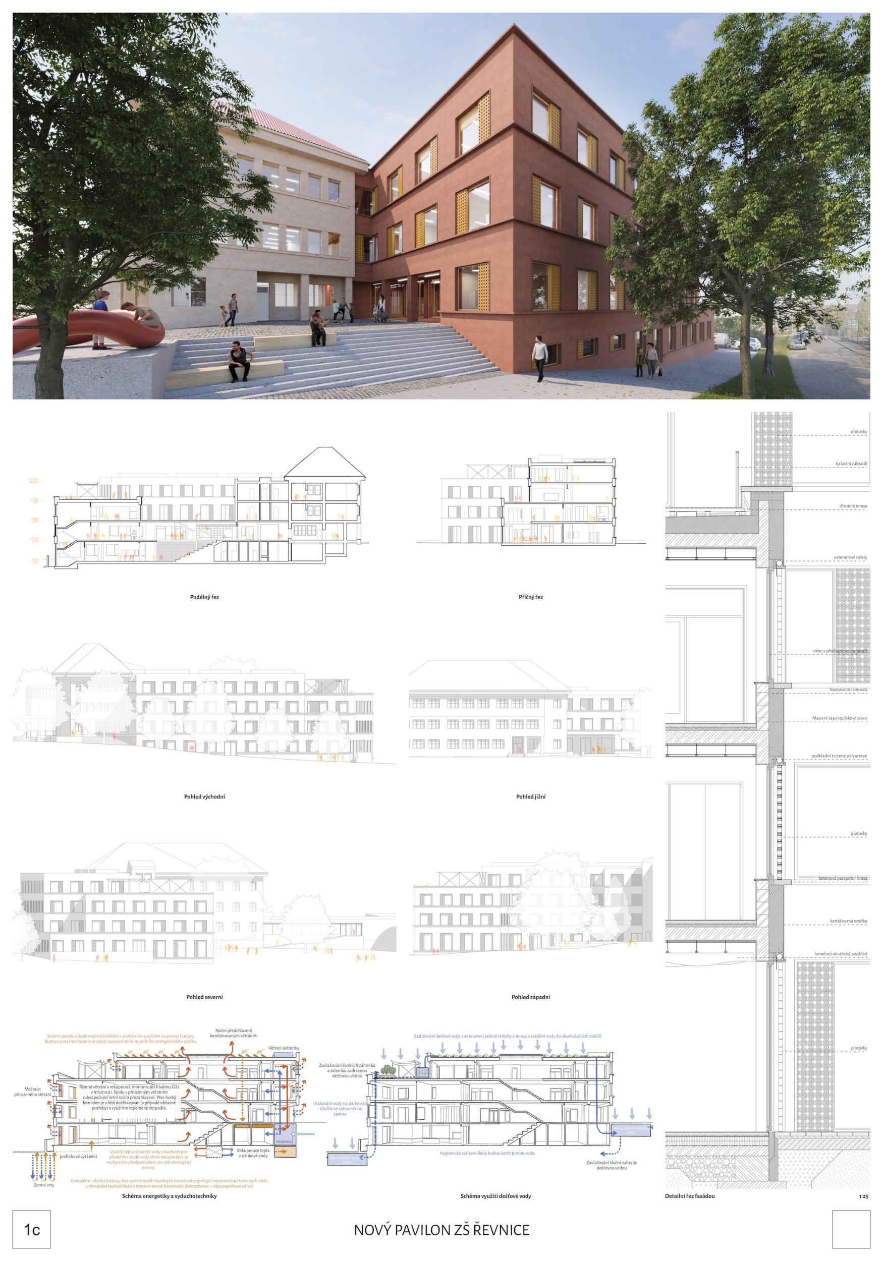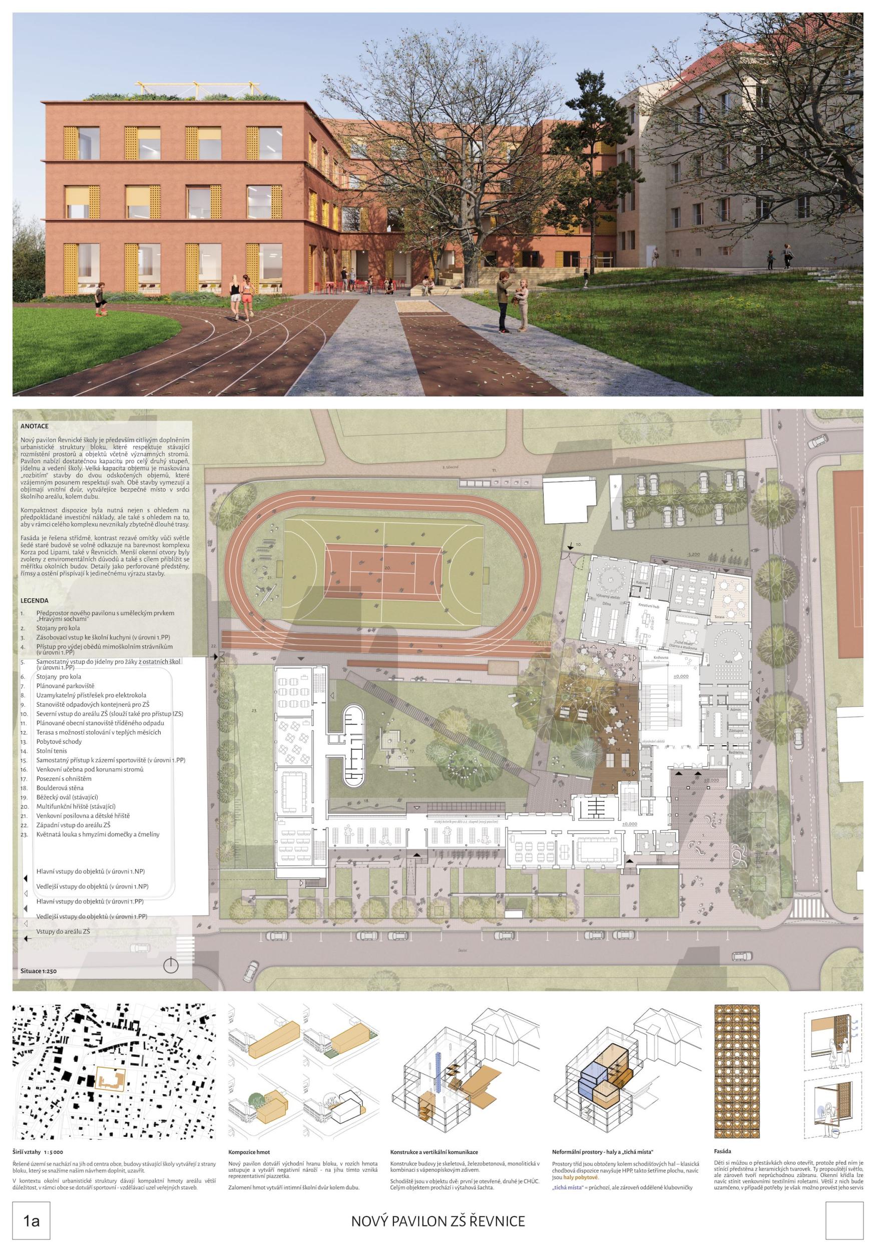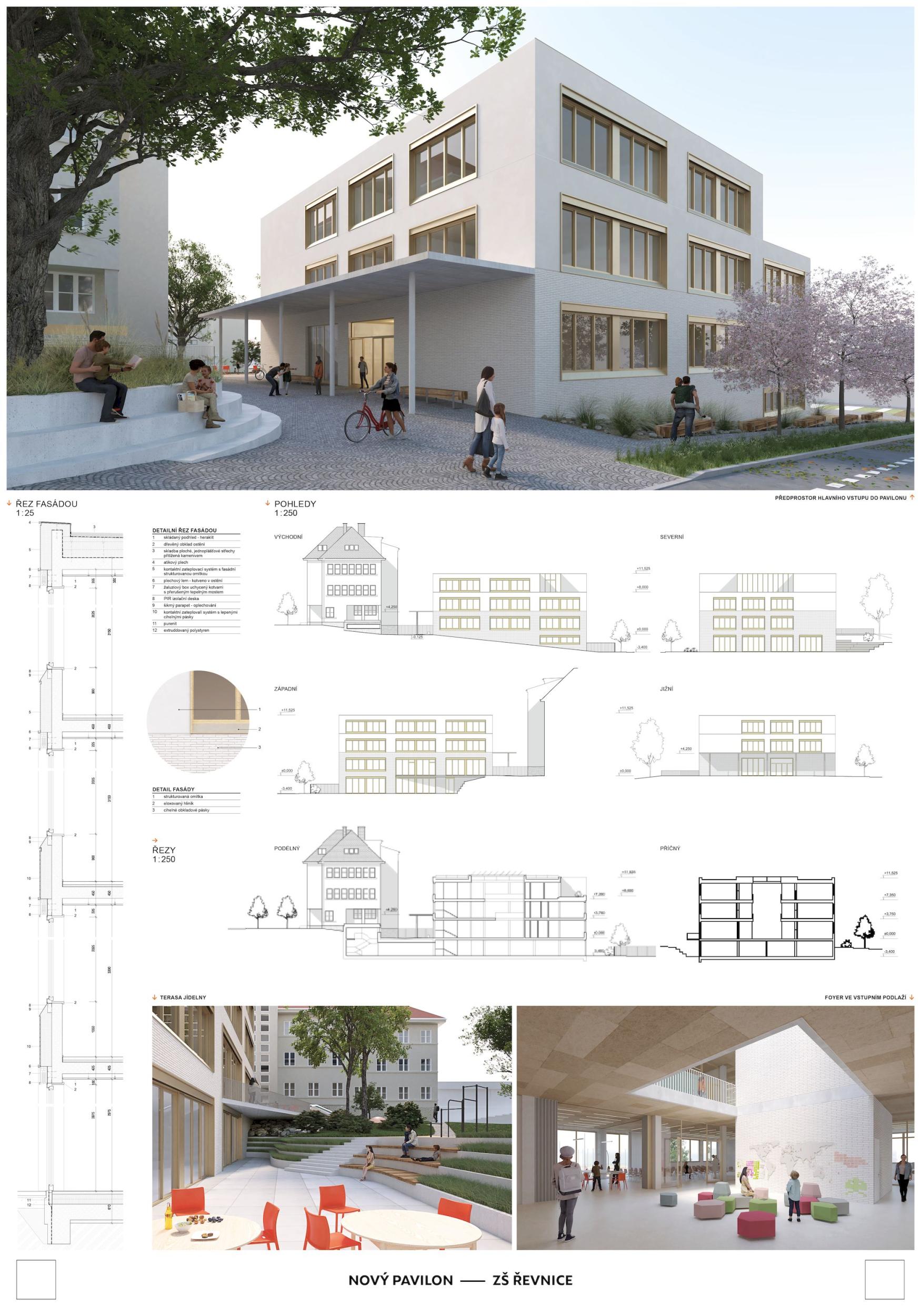 Nový pavilon Řevnické školy je především citlivým doplněním urbanistické struktury bloku, které respektuje stávající rozmístění prostorů a objektů včetně významných stromů. Pavilon nabízí dostatečnou kapacitu pro celý druhý stupeň, jídelnu a vedení školy. Velká kapacita objemu je maskována „rozbitím“ stavby do dvou odskočených objemů, které vzájemným posunem respektují svah. Obě stavby vymezují a objímají vnitřní dvůr, vytvářejíce bezpečné místo v srdci školního areálu, kolem dubu. Kompaktnost dispozice byla nutná nejen s ohledem na předpokládané investiční náklady, ale také s ohledem na to, aby v rámci celého komplexu nevznikaly zbytečně dlouhé trasy. Fasáda je řešena střídmě, kontrast rezavé omítky vůči světle šedé staré budově se volně odkazuje na barevnost komplexu Korza pod Lipami, také v Řevnicích. Menší okenní otvory byly zvoleny z enviromentálních důvodů a také s cílem přiblížit se měřítku okolních budov. Detaily jako perforované předstěny, římsy a ostění přispívají k jedinečnému výrazu stavby.
