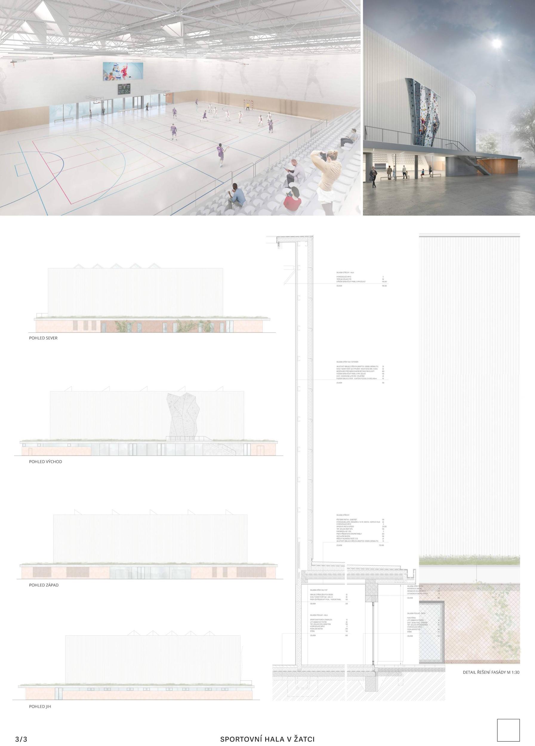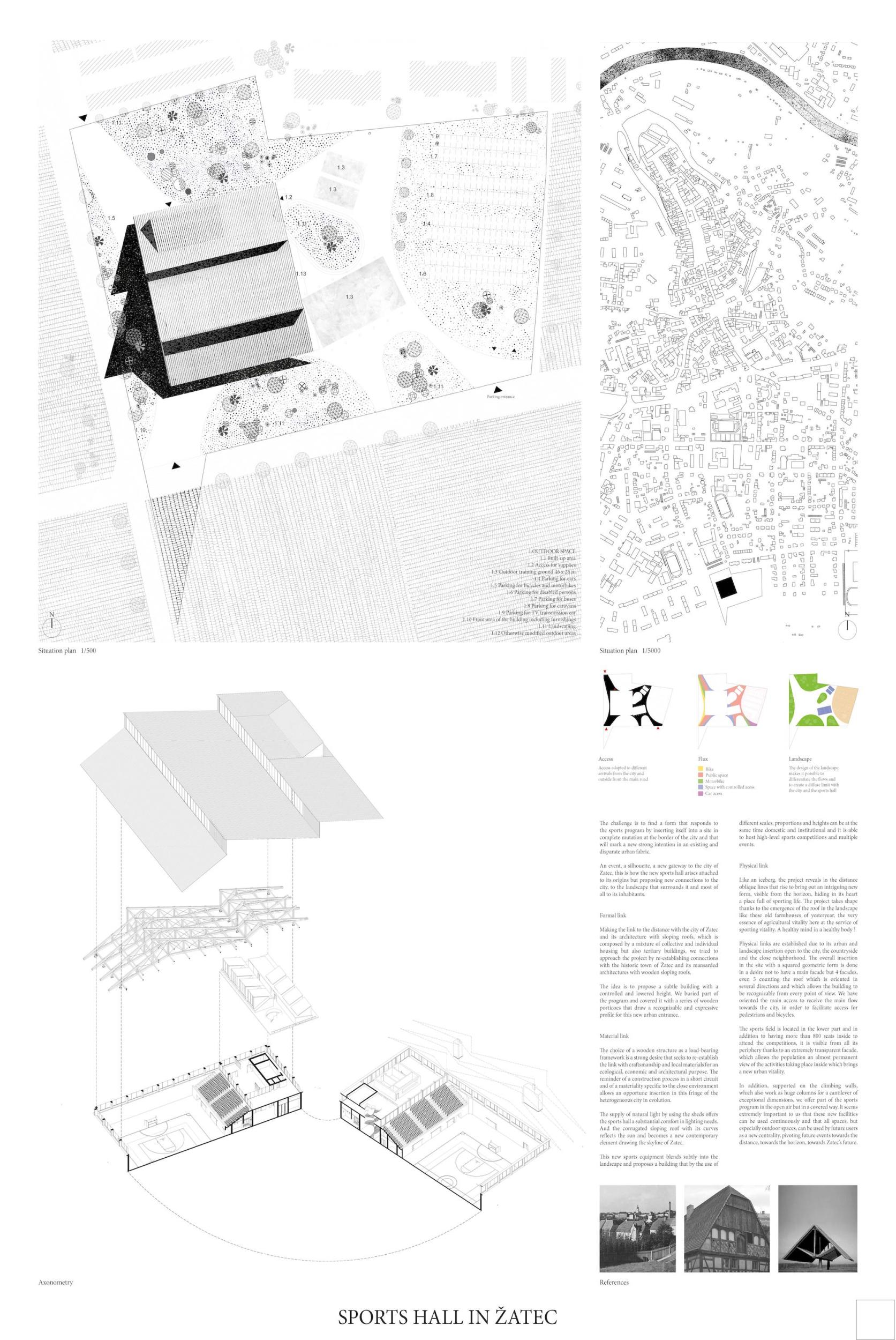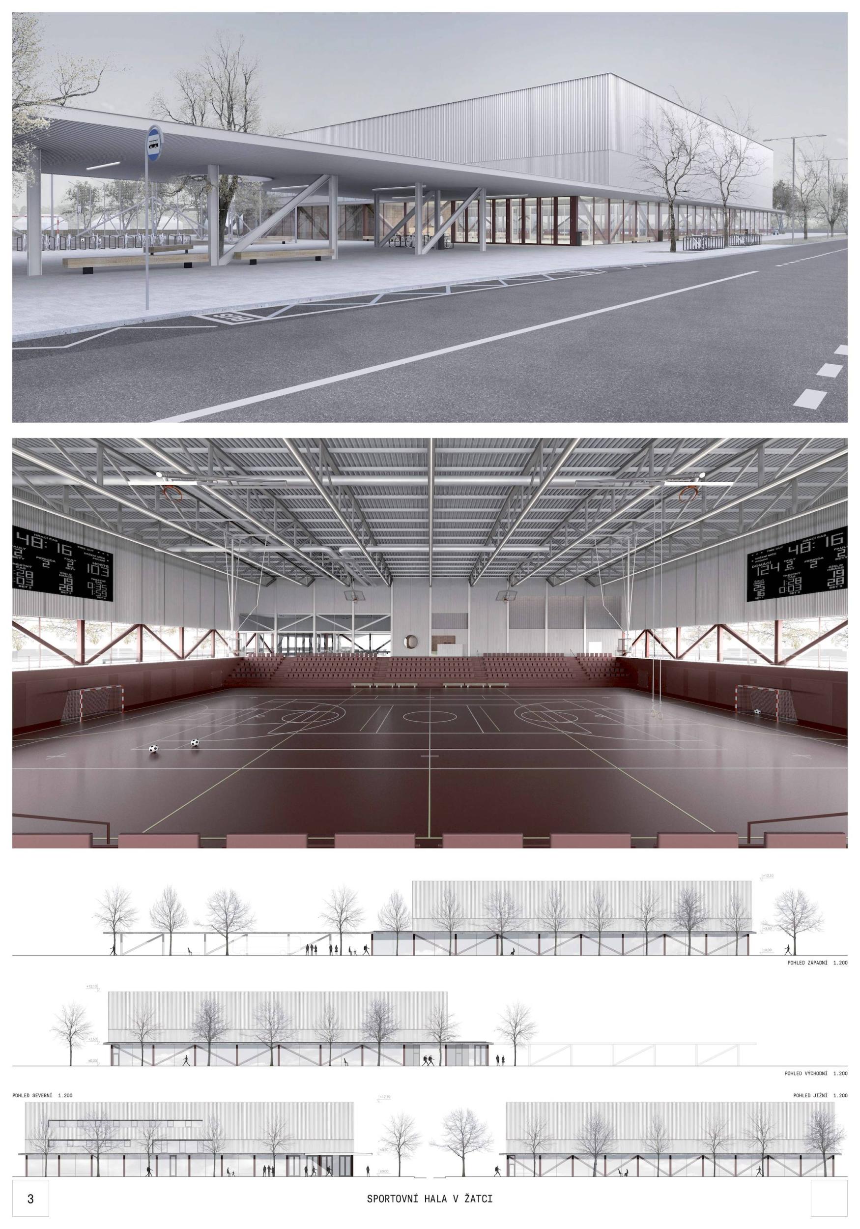 Událost, silueta, nová brána do města Žatce. Tak vzniká nová sportovní hala, která se váže ke svému původu, ale navrhuje nové vazby na město, na krajinu, která ji obklopuje, a především na jeho obyvatele. Nová sportovní hala v Žatci se skládá ze tří hlavních prvků: polozapuštěného programu, řady konstrukčních dřevěných rámů a otevřeného a krytého venkovního prostoru, který tvoří novou centrálu a nové veřejné náměstí ve městě. Nové zařízení se decentně usazuje do krajiny s kontrolovanou výškou, ale výrazná silueta jeho konstrukčních dřevěných rámů umožňuje, aby byla budova snadno rozpoznatelná. Projekt s 5 hlavními fasádami, který navrhuje novou krajinu při vstupu do Žatce.