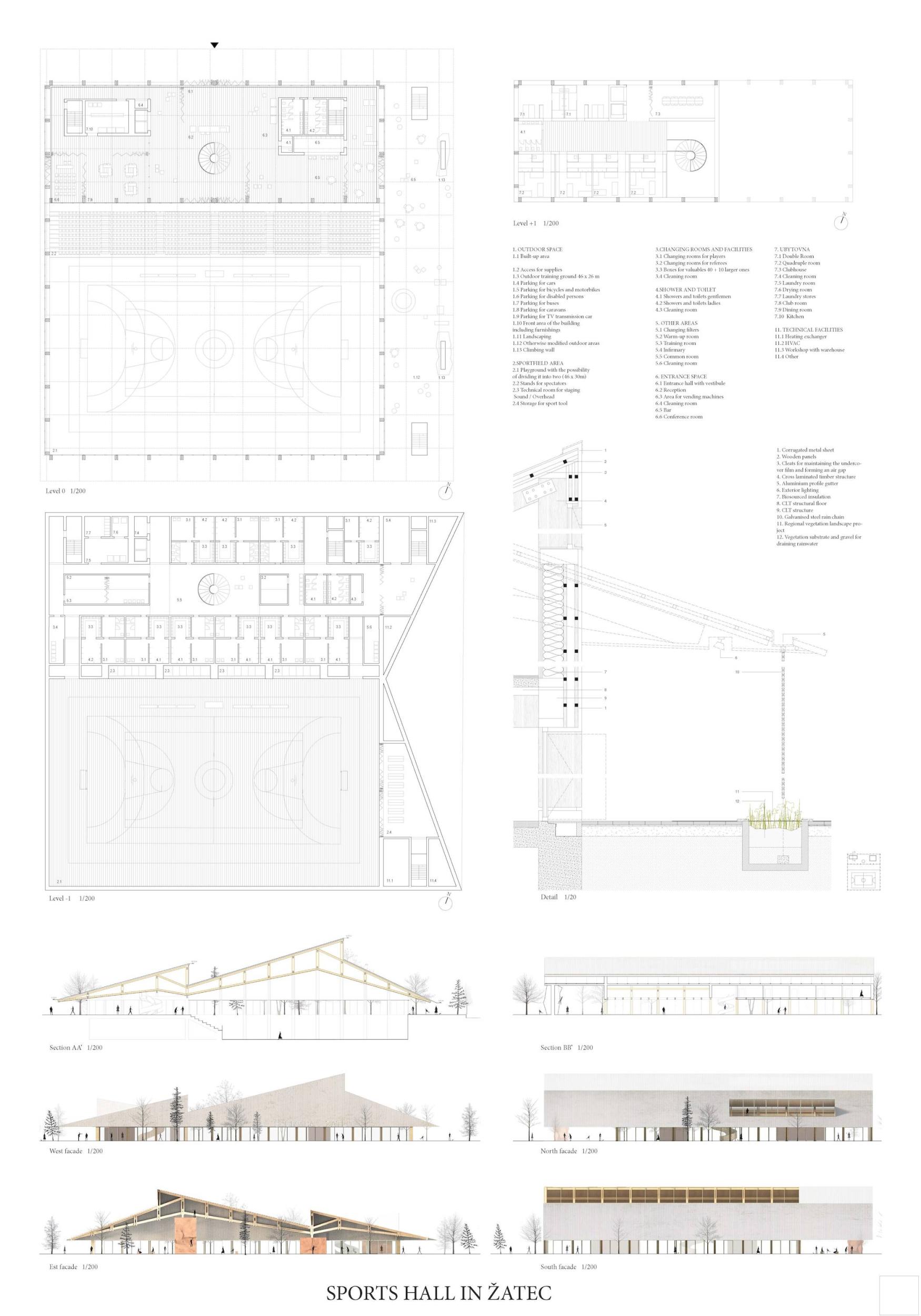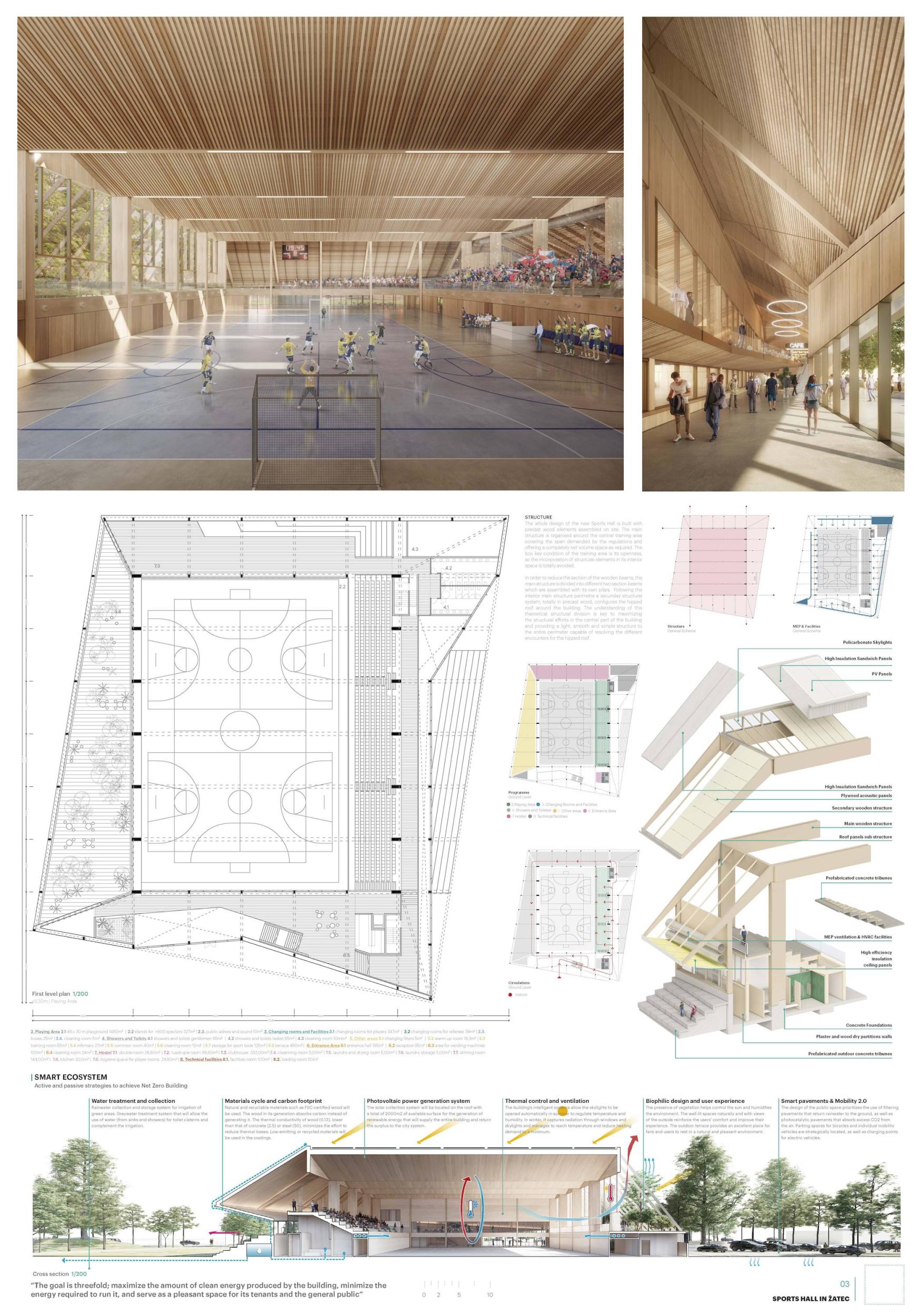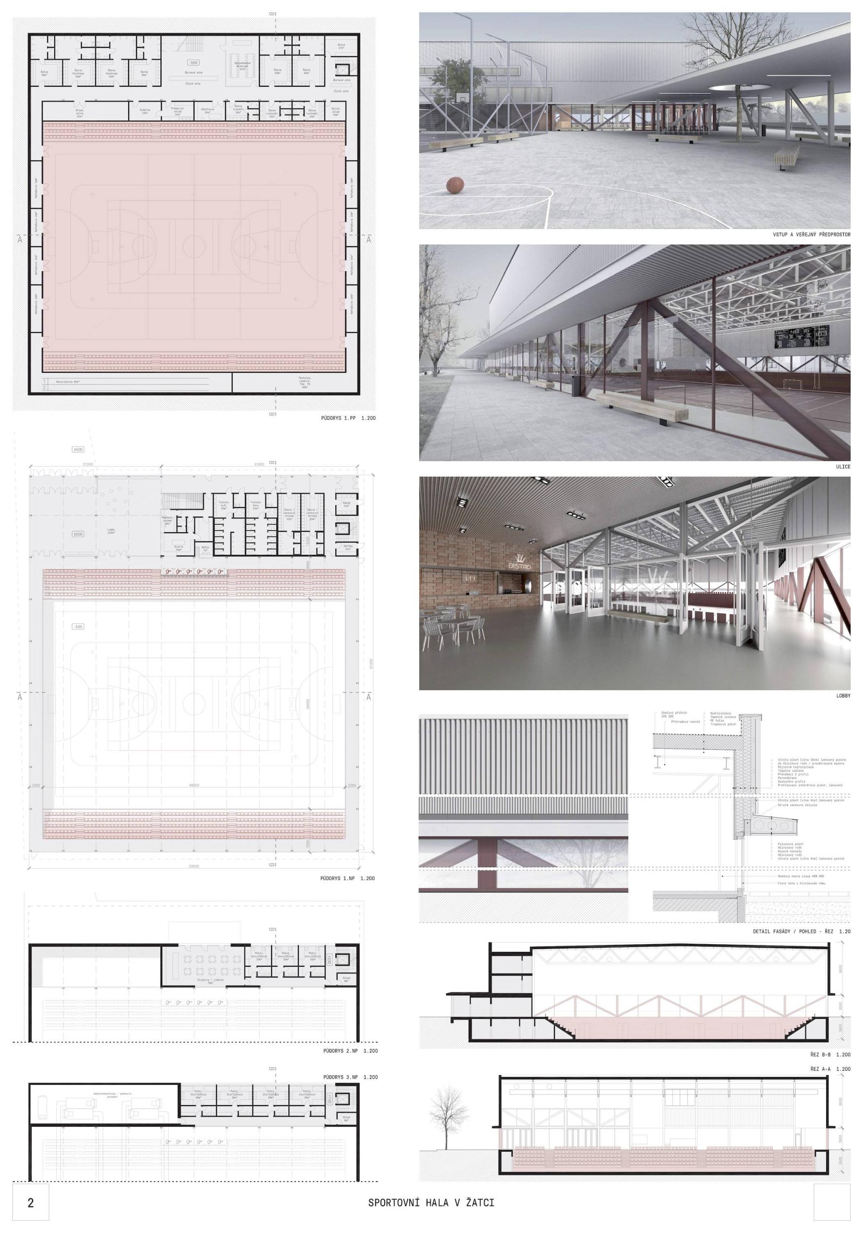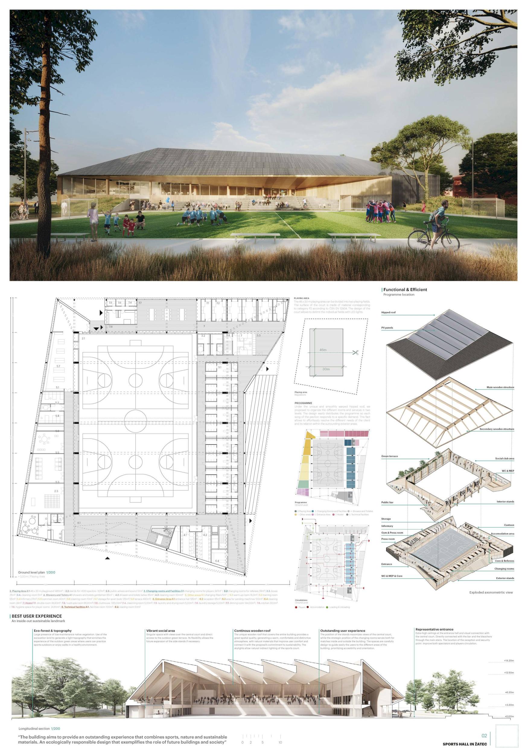 Událost, silueta, nová brána do města Žatce. Tak vzniká nová sportovní hala, která se váže ke svému původu, ale navrhuje nové vazby na město, na krajinu, která ji obklopuje, a především na jeho obyvatele. Nová sportovní hala v Žatci se skládá ze tří hlavních prvků: polozapuštěného programu, řady konstrukčních dřevěných rámů a otevřeného a krytého venkovního prostoru, který tvoří novou centrálu a nové veřejné náměstí ve městě. Nové zařízení se decentně usazuje do krajiny s kontrolovanou výškou, ale výrazná silueta jeho konstrukčních dřevěných rámů umožňuje, aby byla budova snadno rozpoznatelná. Projekt s 5 hlavními fasádami, který navrhuje novou krajinu při vstupu do Žatce.