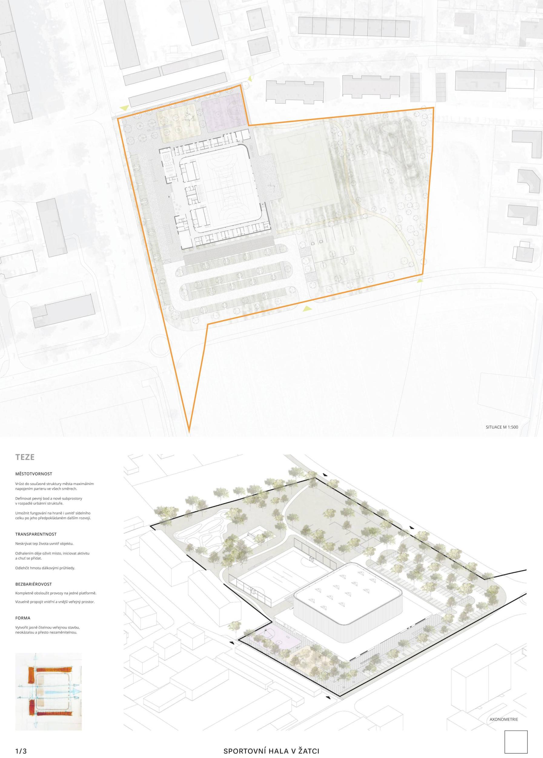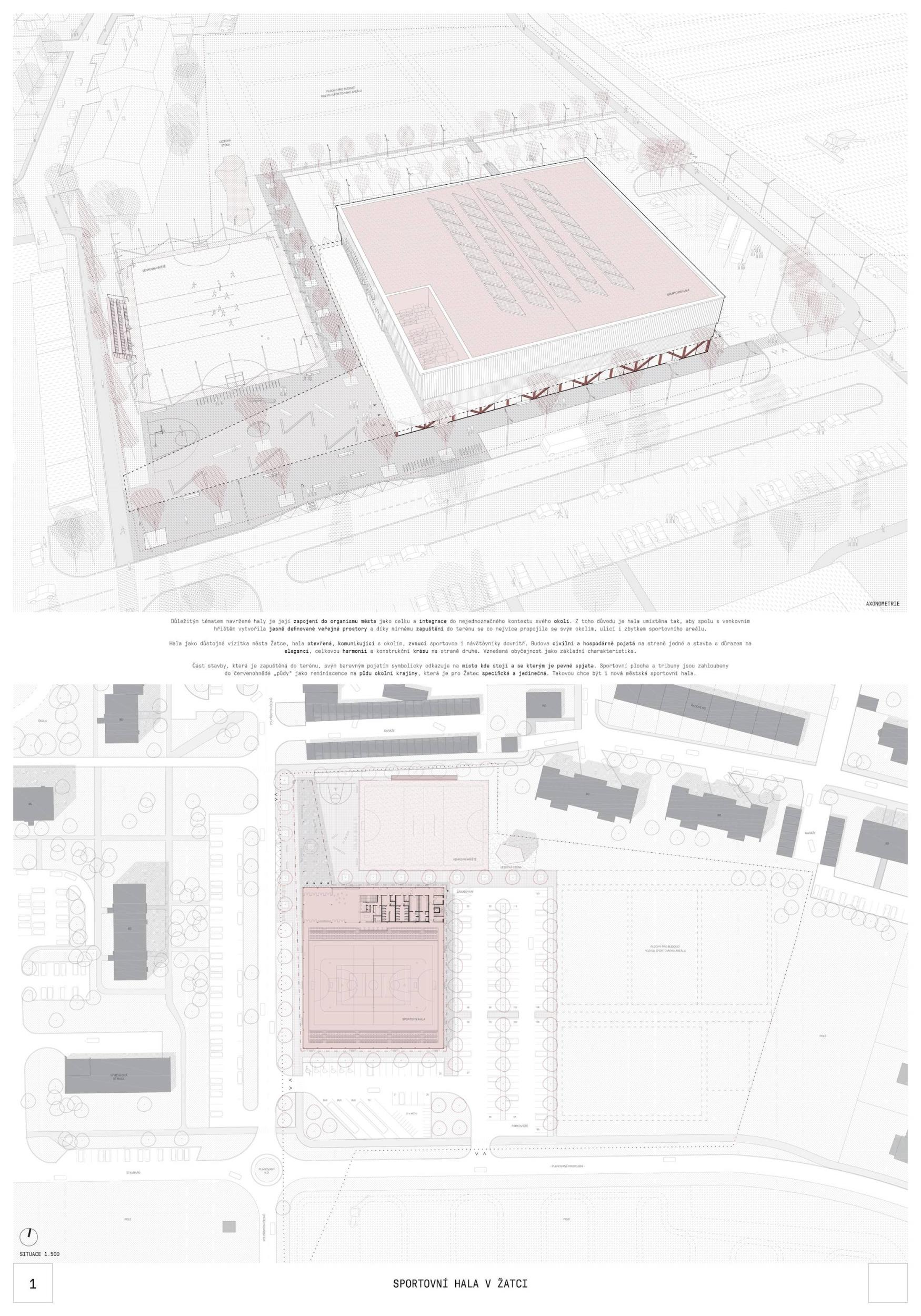 Urbanisticky je stavba svým vstupem otočena k ulici Volyňských Čechů, což bylo pozitivně porotou hodnoceno VN také s ohledem na dostatečně velkou rozptylovou plochu a representativní vstup do budovy, jenž je orientovaný přibližně uprostřed dispozice. Vstup do budovy plynule navazuje na ulici a případnou autobusovou zastávku, jenž by měla být v blízkosti haly. Studie též uvažuje s parkem a dalšími plochami pro budoucí rozvoj. Architektonické vnímání budovy je velmi pozitivní, uklidňující. Autor do spodního parteru symbolicky zrcadlí červenozem, jenž je významná půda pro pěstování chmele na Žatecku. Přidanou hodnotou jsou také ozeleněné střechy spodního parteru a popínavé rostliny na fasádě, jenž dále zjemňují hmotu budovy. Provoz budovy je velice správně rozvržen, začíná reprezentativním foyer s možností rozptylu osob do tří stran, provoz cvičenců nekoliduje s pohybem návštěvníků. Oceňujeme přímý vstup z foyer na tribunu, vyvýšenou tribunou, čímž vzniká přirozený mantinel. Návrh řeší dostatečný prostor pro ukládání sportovního vybavení, vč. dostatečně plošných nářaďoven. Dispozice budovy je mj. je uzpůsobena přímému vstupu ze šaten na hřiště umístěné v exteriéru, přičemž je dále k dispozici temperovaný sklad a přímý vstup do hygienického zázemí. Na základě takto detailního řešení porota uvěřila, že autoři návrhů skutečně pracovali s informacemi od uživatelů hal v jiných městech. Za pozitivní vnímáme také bezbariérovost. Denní osvětlení haly podél atiky považujeme za důmyslné.