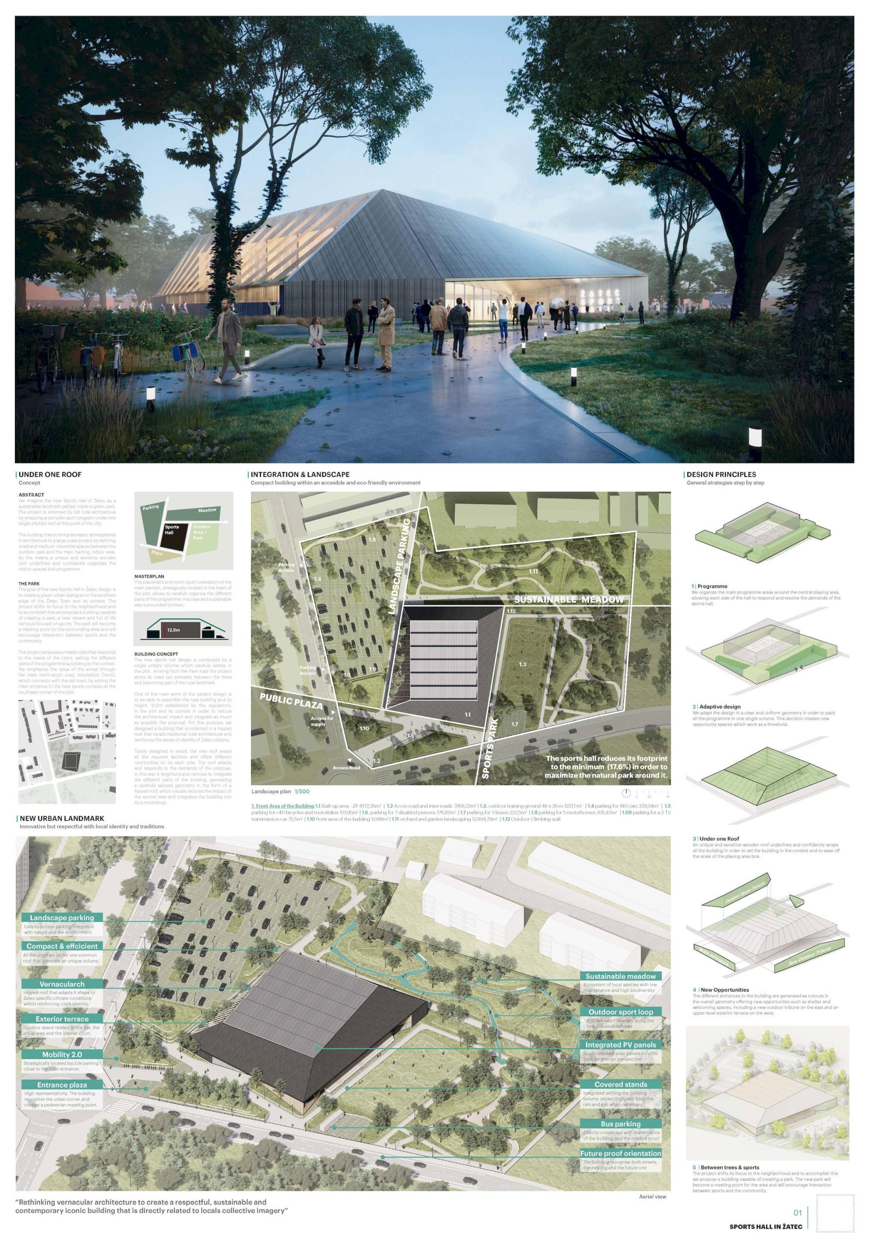 Novou žateckou sportovní halu si představujeme jako udržitelnou dominantu zasazenou do zeleného parku. Projekt je poučen starou venkovskou architekturou tím, že v tomto místě města Žatce zabaluje komplexní sportovní program pod jednu jedinou šikmou střechu. Stavba se snaží vnést domácí atmosféru v architektuře do rozsáhlého projektu vymezením malých a středních meziprostorů mezi venkovním parkem a hlavním tréninkovým krytým prostorem. Tímto způsobem jedinečná a citlivá dřevěná střecha podtrhuje a sebevědomě organizuje vnitřní prostory a program.
