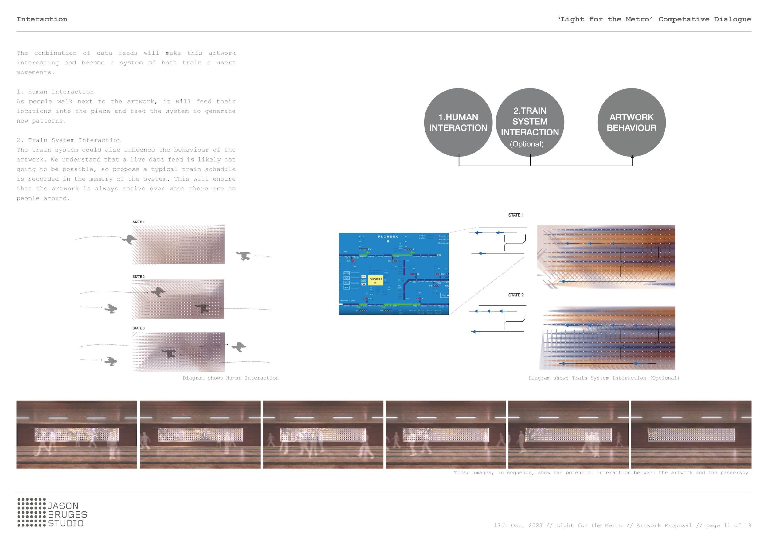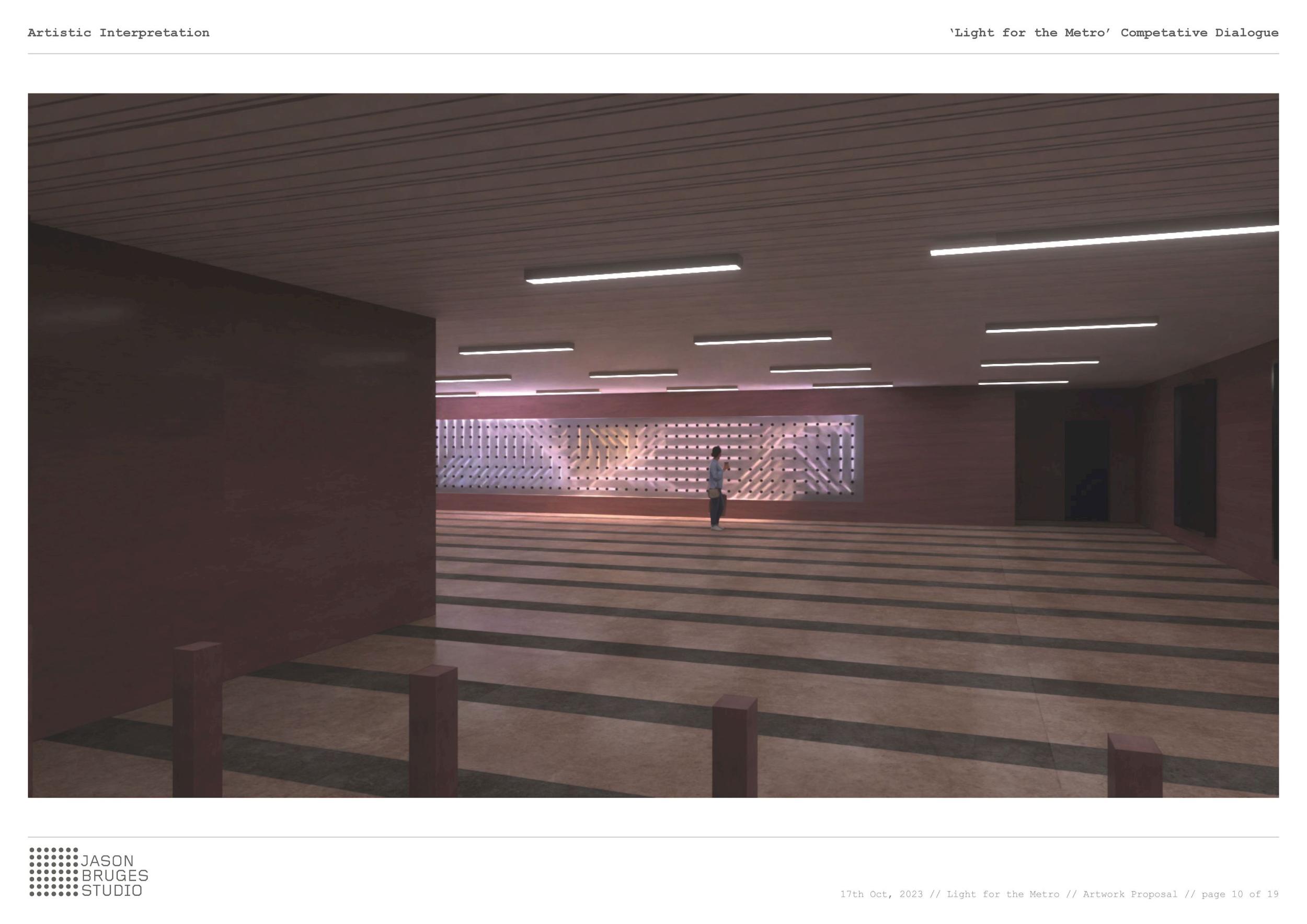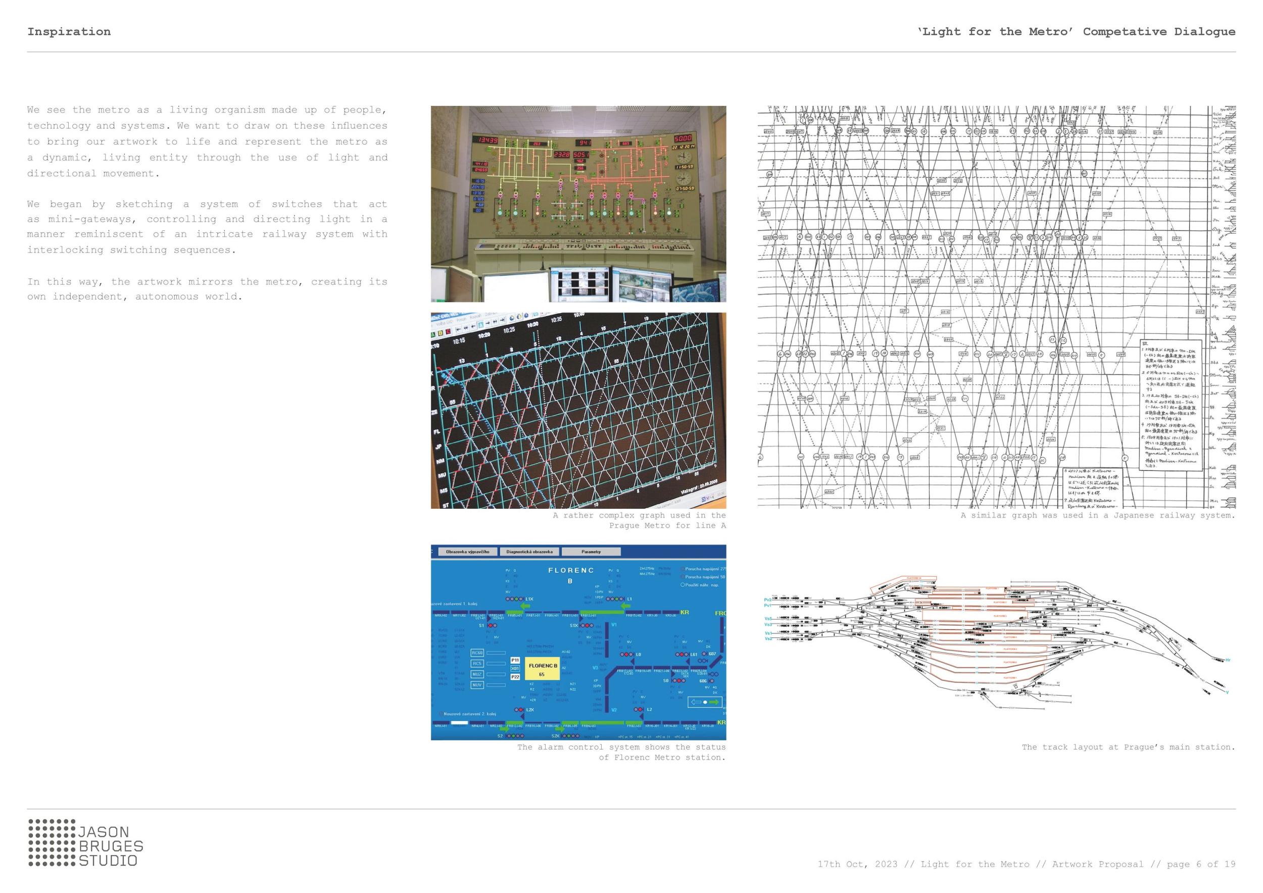 Metro vnímáme jako živý organismus složený z lidí, technologií a systémů. Chceme z těchto vlivů čerpat, abychom oživili naše umělecké dílo a představili metro jako dynamickou, živou entitu pomocí světla a směrového pohybu. Začali jsme náčrtem systému výhybek, které fungují jako miniaturní brány, ovládají a usměrňují světlo způsobem připomínajícím složitý železniční systém se vzájemně propojenými výhybkovými sekvencemi. Dílo tak zrcadlí metro a vytváří svůj vlastní nezávislý, autonomní svět.