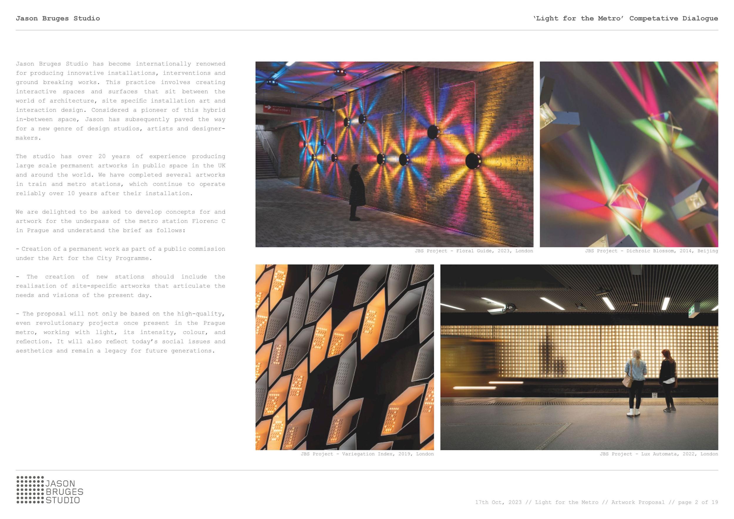 Komise oceňuje nápad převést prostorovou orientaci na povrchu také do podzemí. Pochybnosti má však o úspěšnosti převedení konceptu do samotného návrhu, jehož výsledek se jí zdá nečitelný. Lze samozřejmě připustit, že by pochopení tvarosloví a natočení jednotlivých prvků nebylo pro běžného kolemjdoucího/cestujícího podstatné. Pro komisi byla také diskutabilní míra interakce hlavního světelného motivu s existujícím nástěnným dílem a viditelnost navrhovaného řešení, tedy jeho skutečné působení v prostoru. Navržené technické parametry řešení hlavního prvku jsou popsané pochopitelně a v náležitém detailu, což neplatí o menších liniových elementech díla. Celkové náklady jsou dle názoru komise reálné, pravděpodobně mírně podhodnocené. Komise si je vědoma, že soutěžní návrhy nemohou přesně stanovit investiční náklady, a že se k nim zadavatel dopracuje teprve při dalších fázích zpracování projektové dokumentace. V tomto případě se dá očekávat ještě navýšení nákladů.