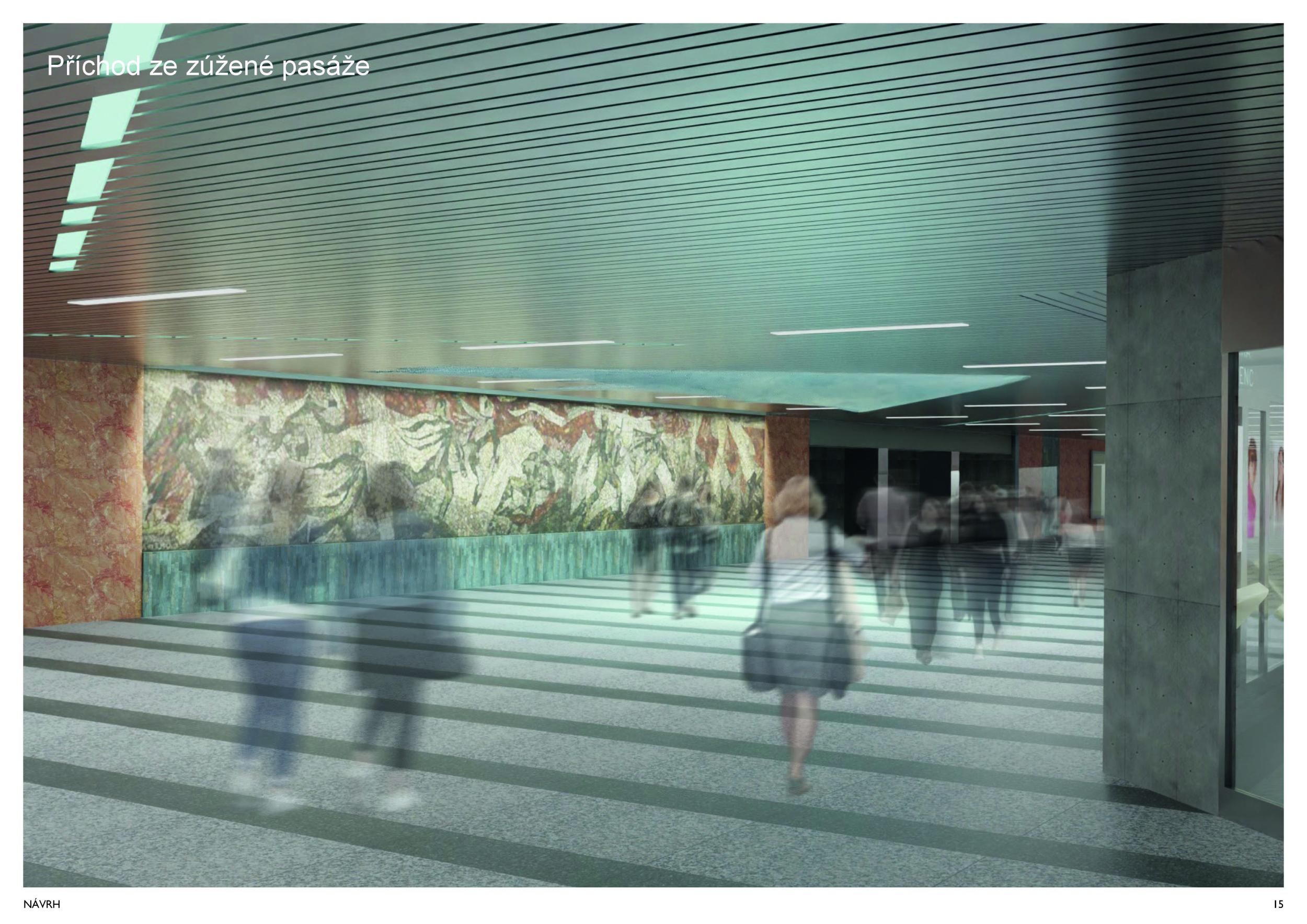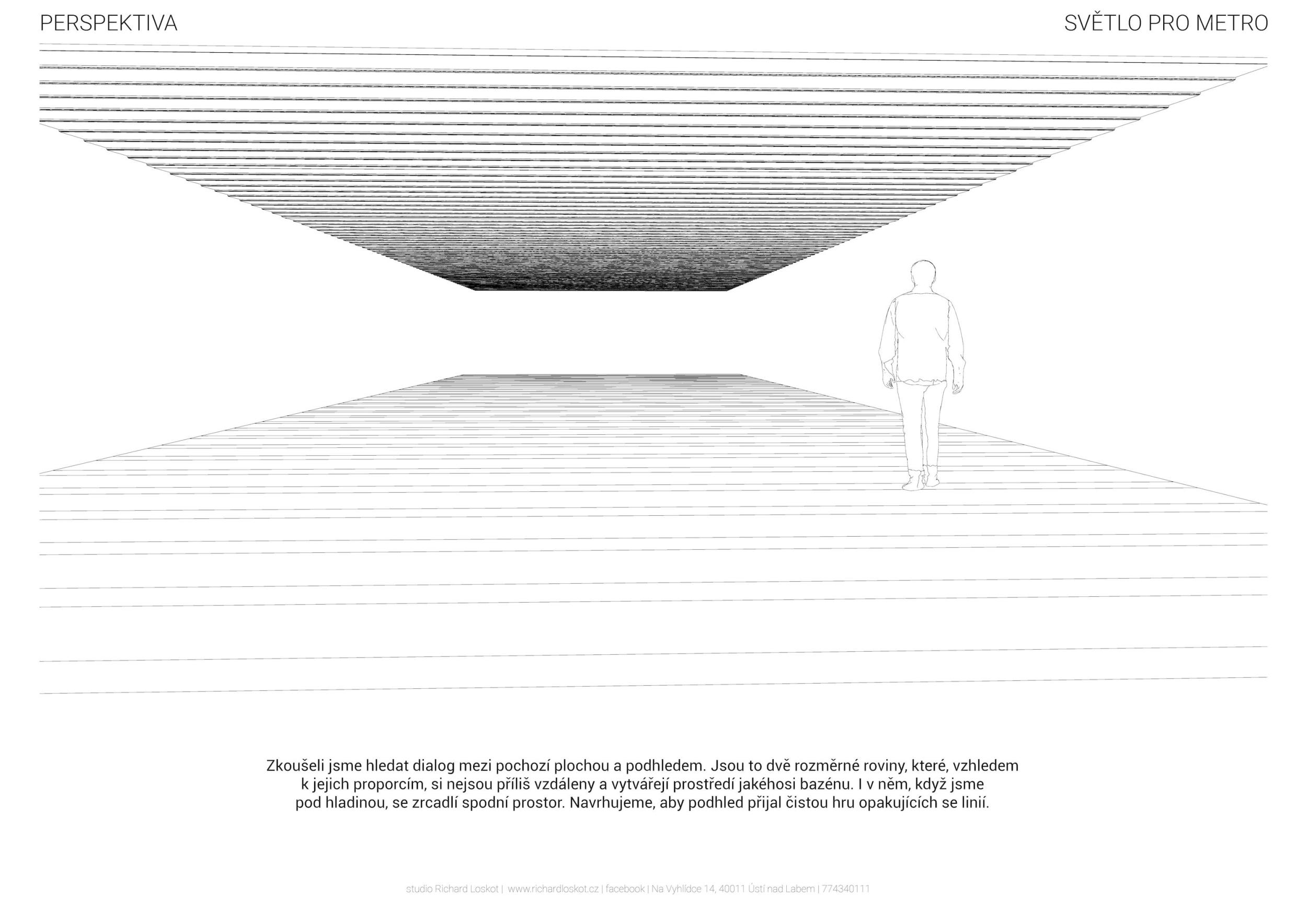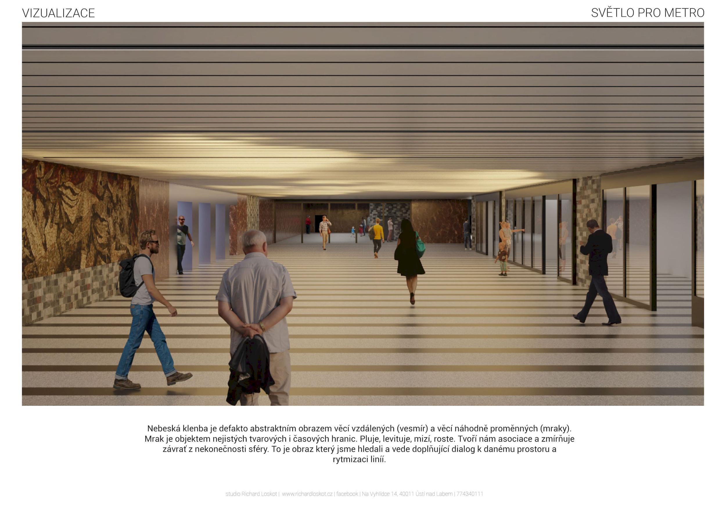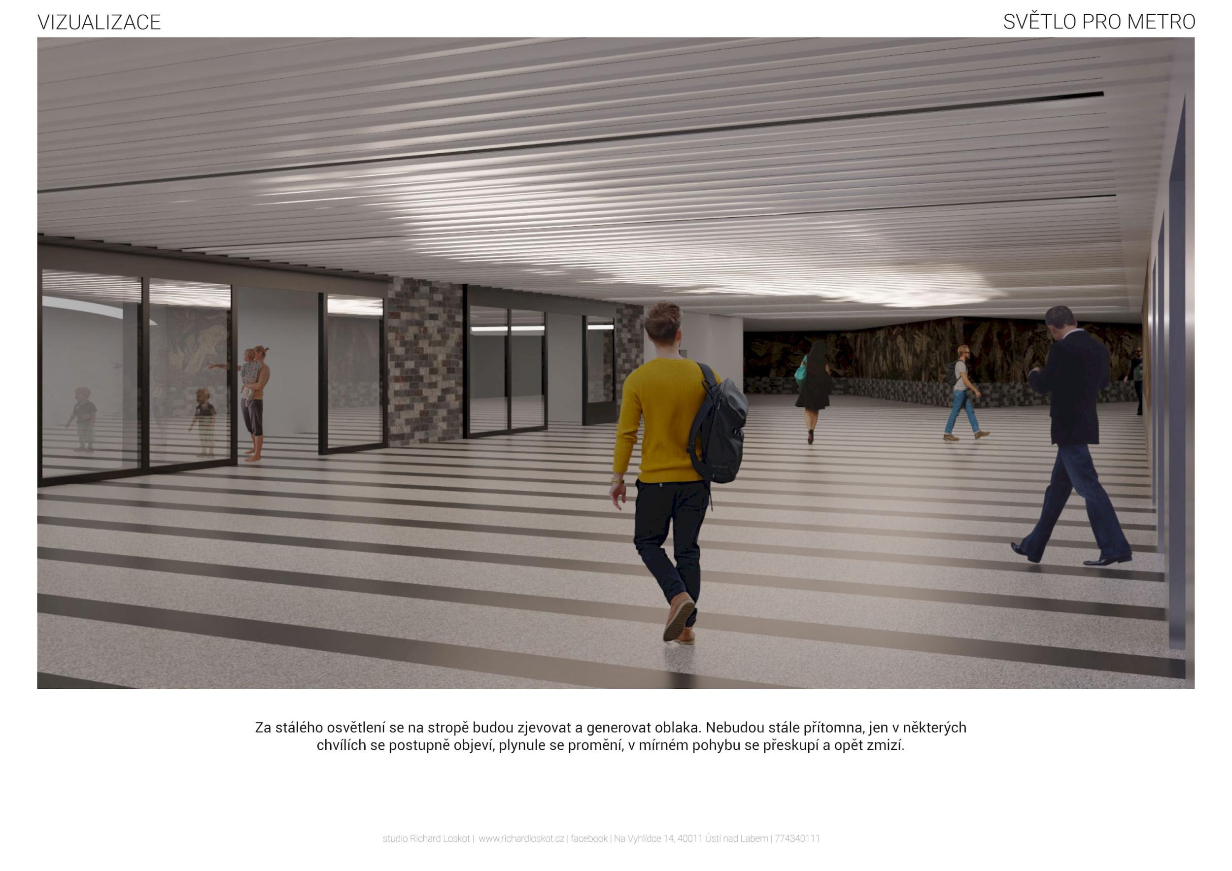 Stěžejním momentem pro náš nápad bylo střídání tmavého a světlého pochozího kamene, který tvoří opakující se rytmus pruhů, jenž prostor opticky natahují a vytvářejí zajímavou hru perspektivy. Zkoušeli jsme hledat dialog mezi pochozí plochou a podhledem. Jsou to dvě rozměrné roviny, které, vzhledem k jejich proporcím, si nejsou příliš vzdáleny a vytvářejí prostředí jakéhosi bazénu. I v něm, když jsme pod hladinou, se zrcadlí spodní prostor. Navrhujeme, aby podhled přijal čistou hru opakujících se linií. Hledali jsme obraz, který by přinesl do prostředí bez slunce něco z přirozeného světa. Fyzikálnost, která není technická, ale poetická. Za stálého osvětlení se na stropě budou zjevovat a generovat oblaka. Nebudou stále přítomna, jen v některých chvílích se postupně objeví, plynule se promění, v mírném pohybu se přeskupí a opět zmizí. Pohyb mraků má být plynulý. Video je jen ukázkou a je zrychlené. Pohyb je důležitou součástí instalace, která pomáhá kolemjdoucím pochopit záměr. Má však být nerušivý, spíše kontemplativní.