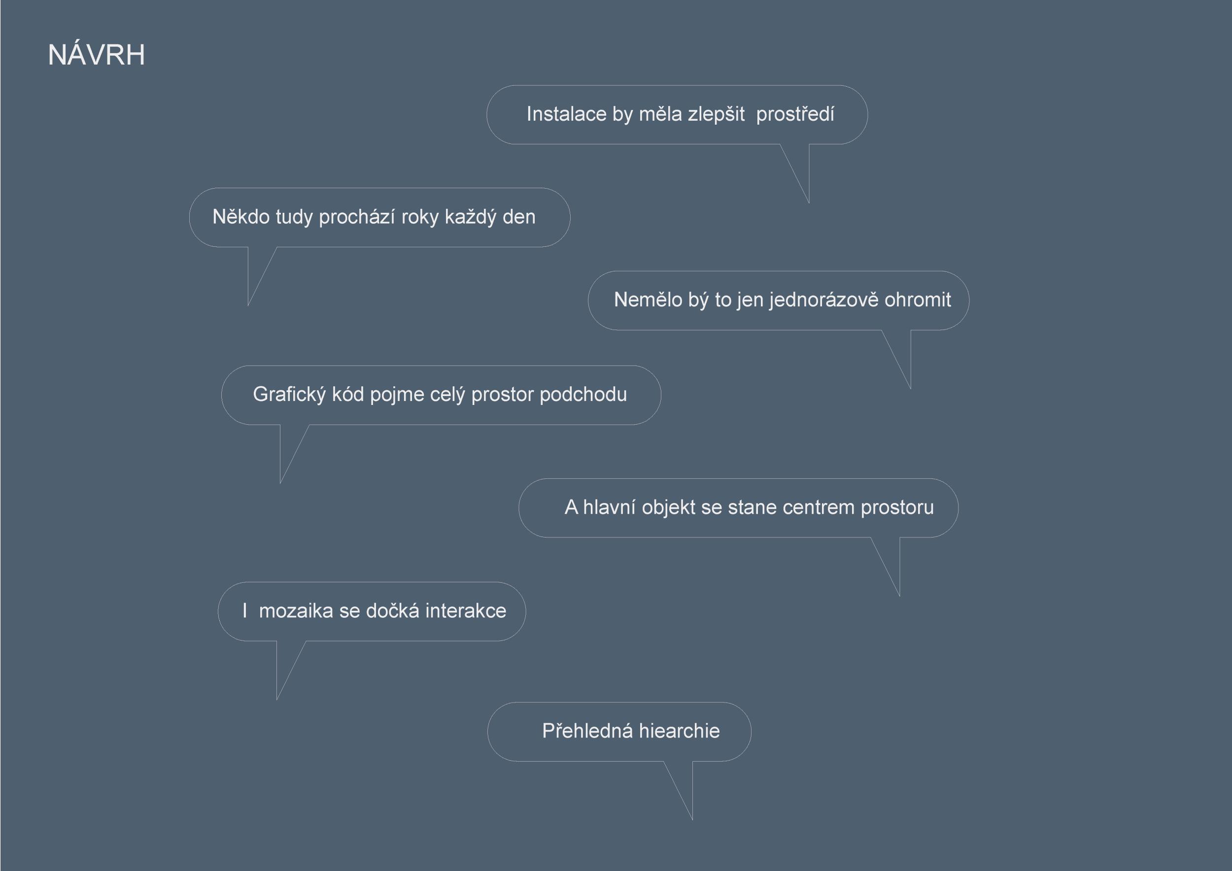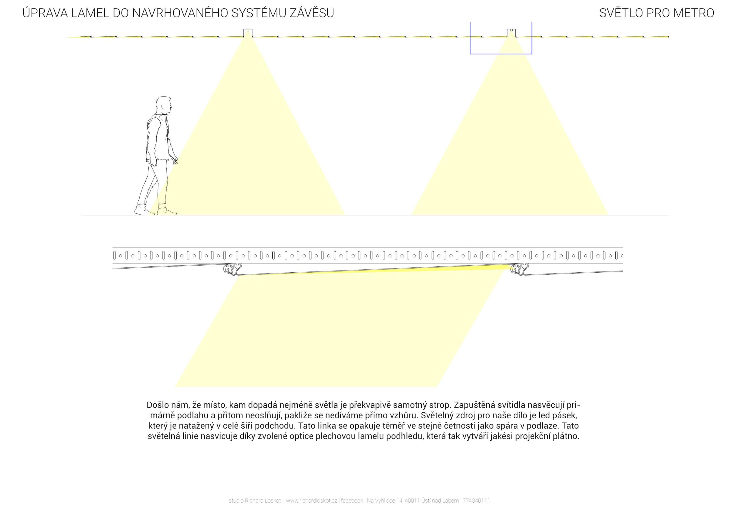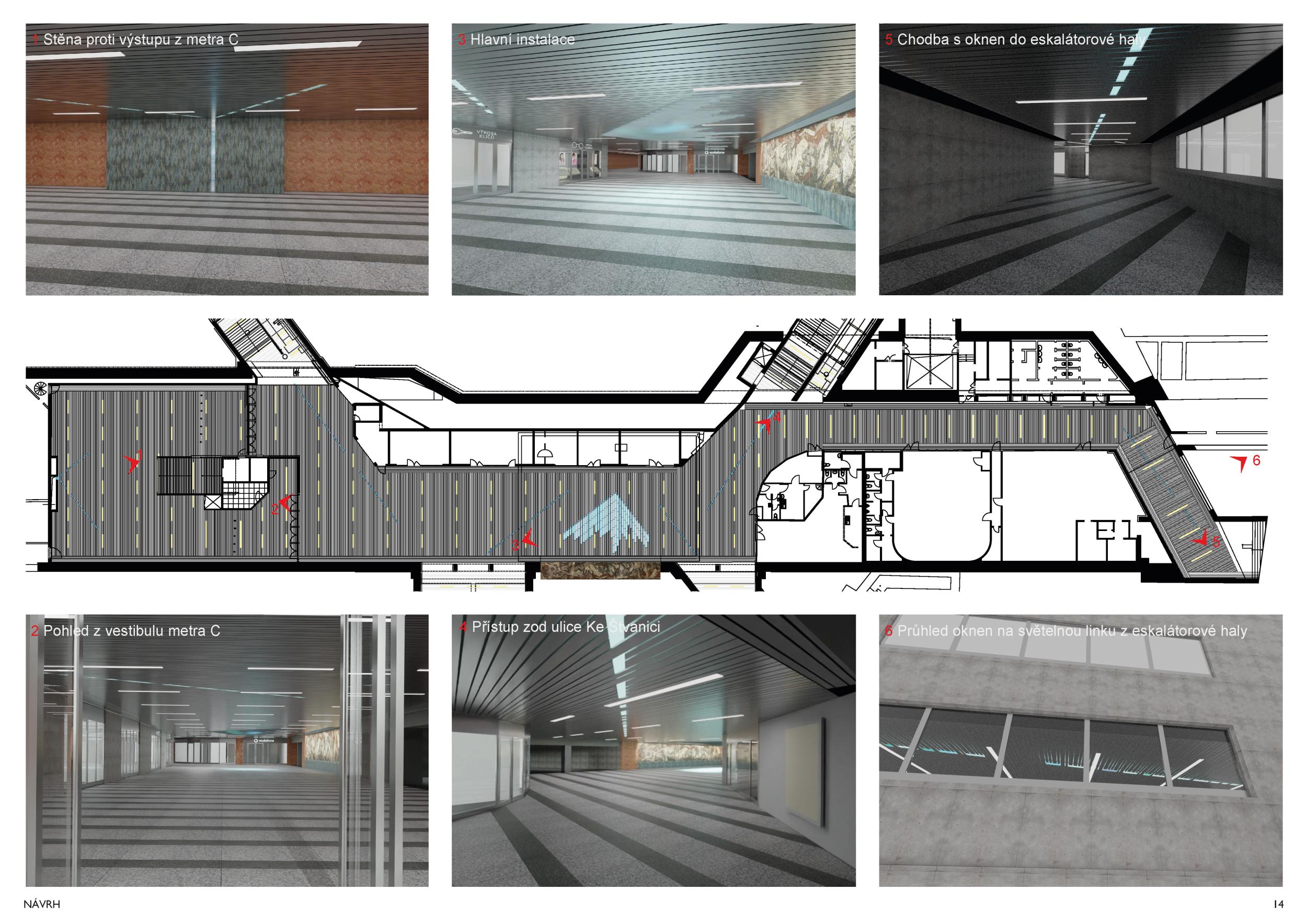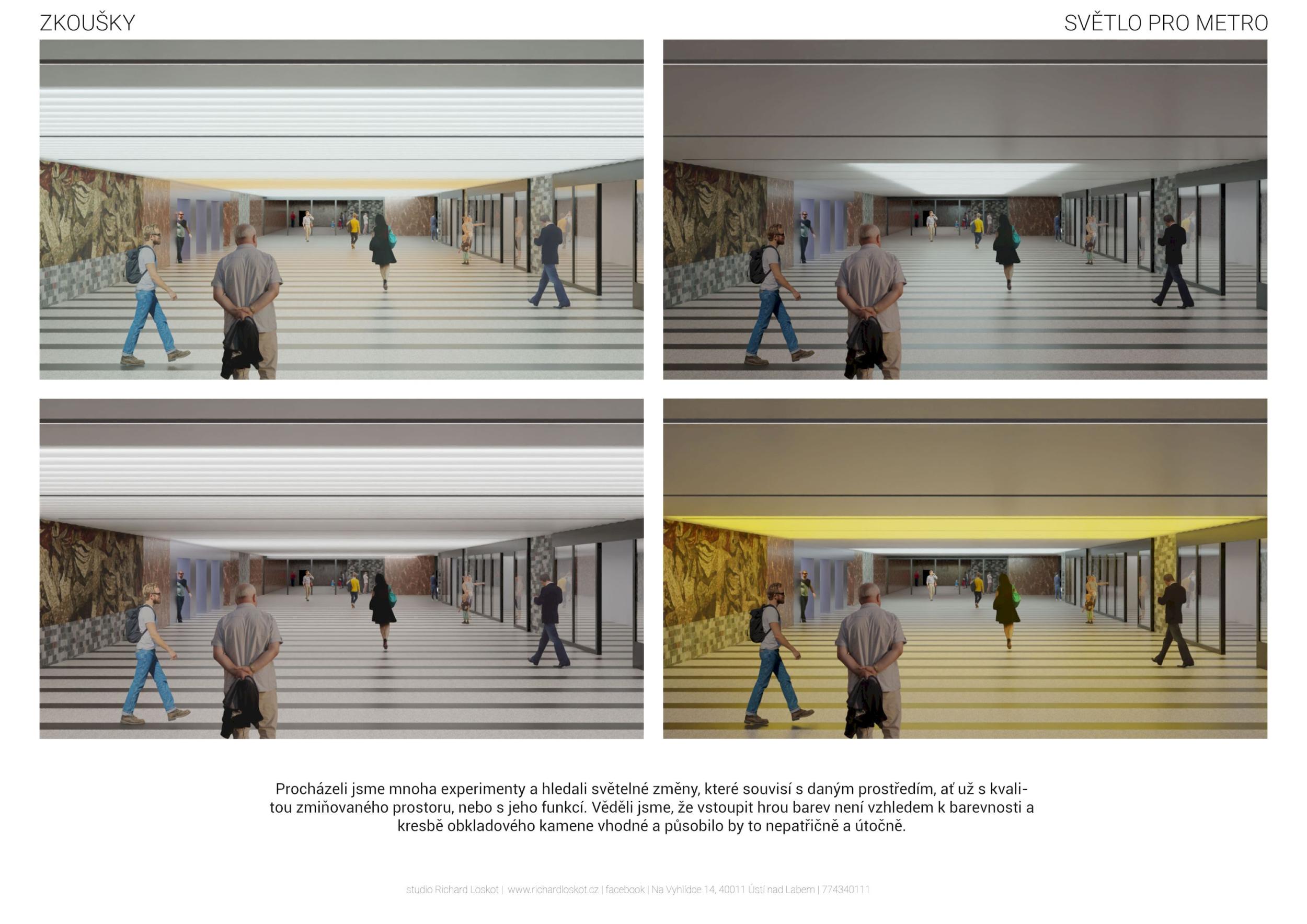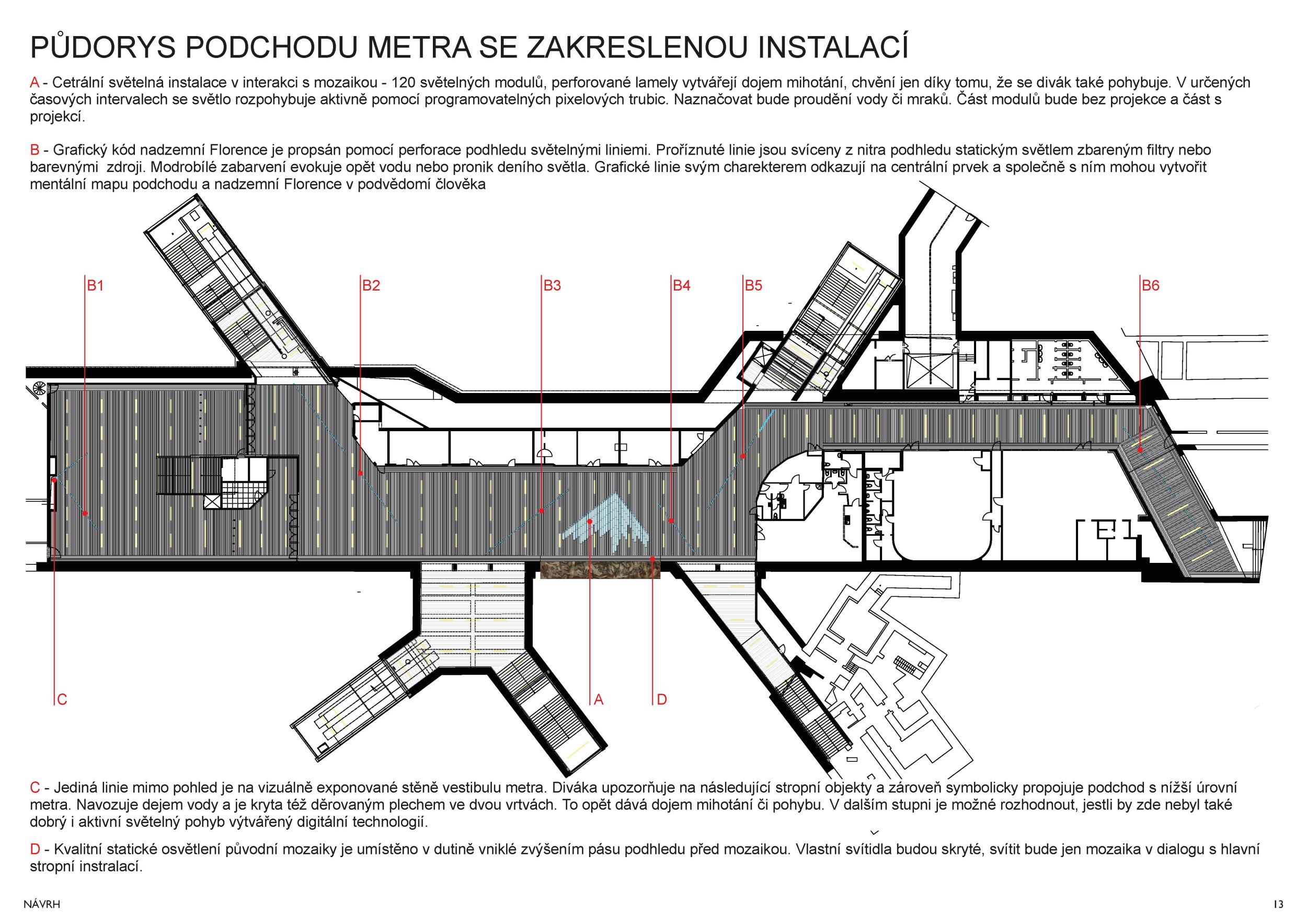 Stěžejním momentem pro náš nápad bylo střídání tmavého a světlého pochozího kamene, který tvoří opakující se rytmus pruhů, jenž prostor opticky natahují a vytvářejí zajímavou hru perspektivy. Zkoušeli jsme hledat dialog mezi pochozí plochou a podhledem. Jsou to dvě rozměrné roviny, které, vzhledem k jejich proporcím, si nejsou příliš vzdáleny a vytvářejí prostředí jakéhosi bazénu. I v něm, když jsme pod hladinou, se zrcadlí spodní prostor. Navrhujeme, aby podhled přijal čistou hru opakujících se linií. Hledali jsme obraz, který by přinesl do prostředí bez slunce něco z přirozeného světa. Fyzikálnost, která není technická, ale poetická. Za stálého osvětlení se na stropě budou zjevovat a generovat oblaka. Nebudou stále přítomna, jen v některých chvílích se postupně objeví, plynule se promění, v mírném pohybu se přeskupí a opět zmizí. Pohyb mraků má být plynulý. Video je jen ukázkou a je zrychlené. Pohyb je důležitou součástí instalace, která pomáhá kolemjdoucím pochopit záměr. Má však být nerušivý, spíše kontemplativní.