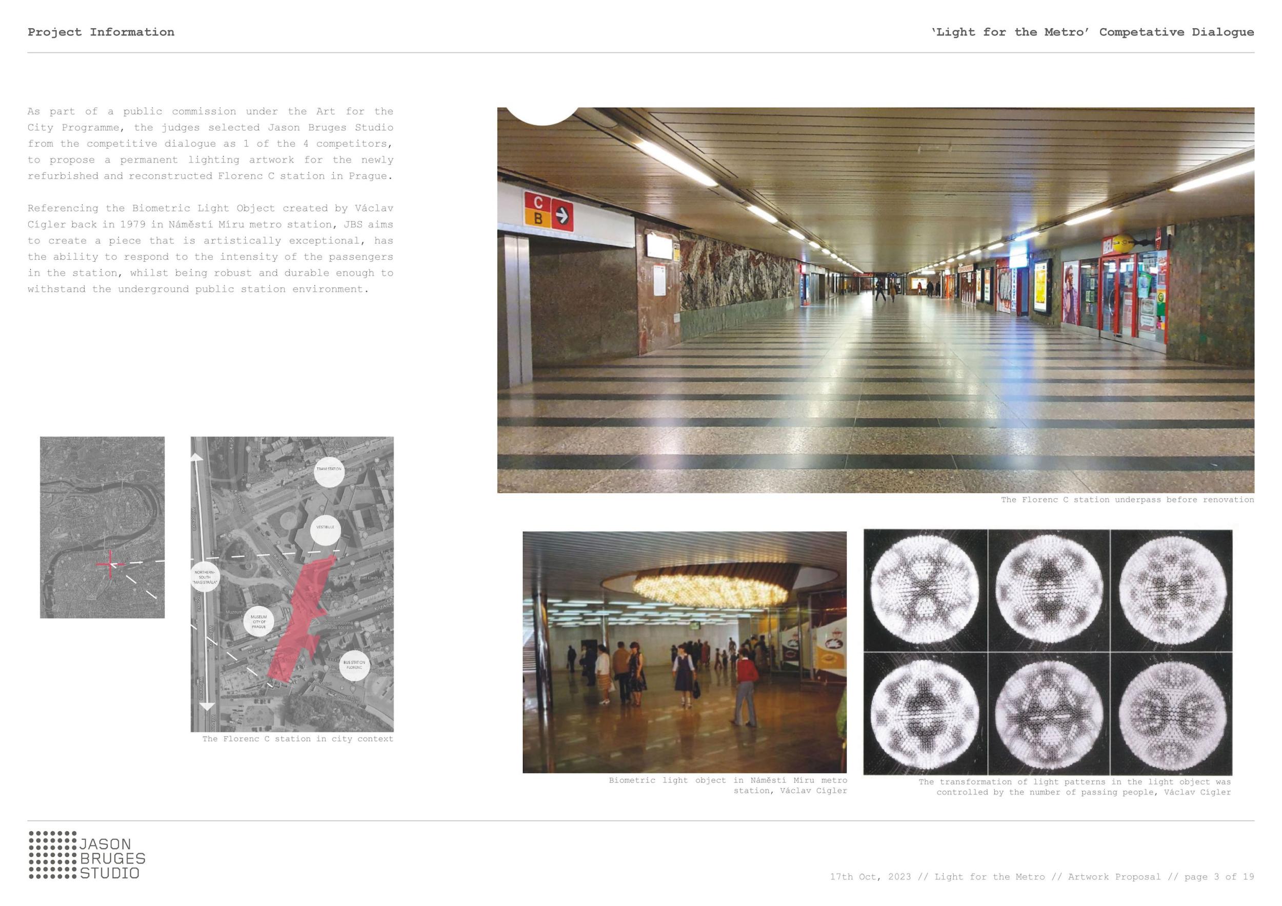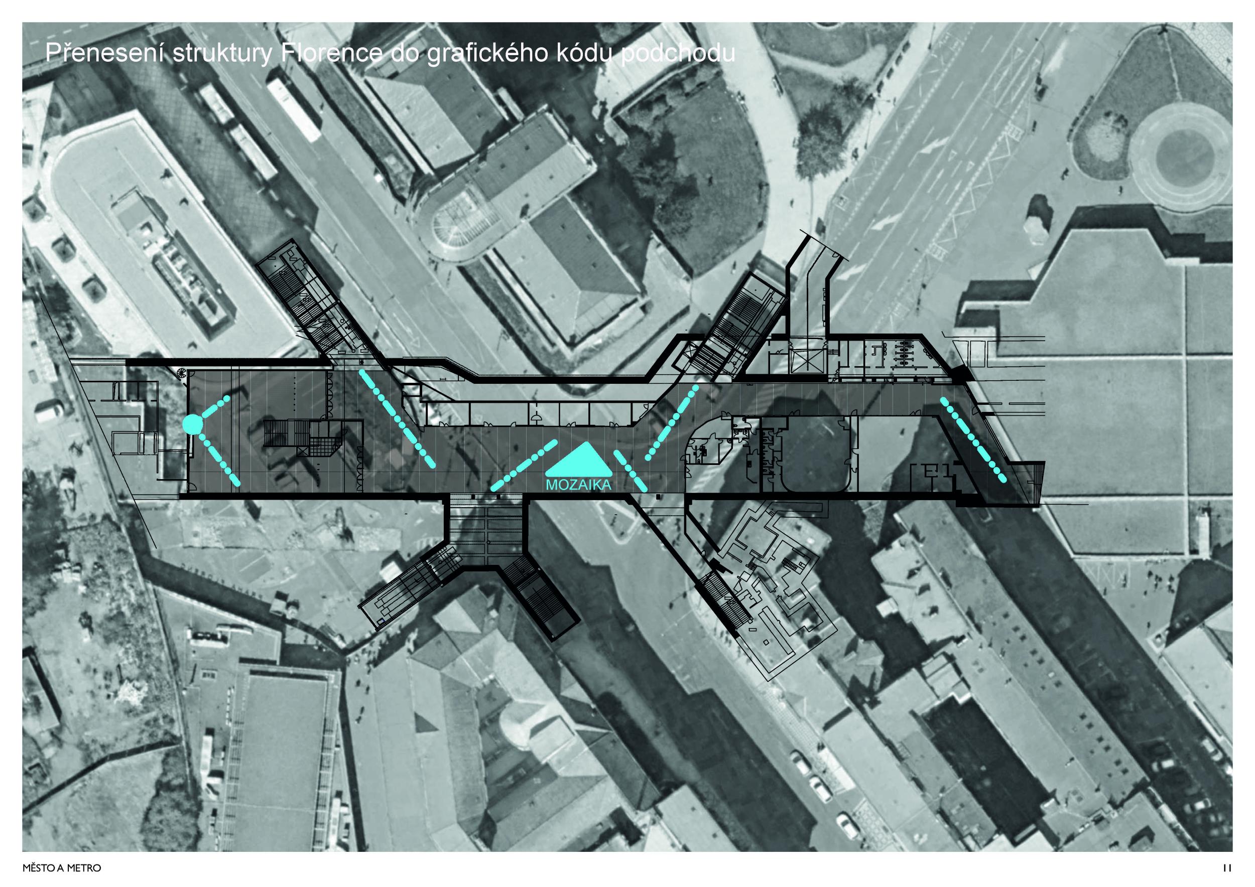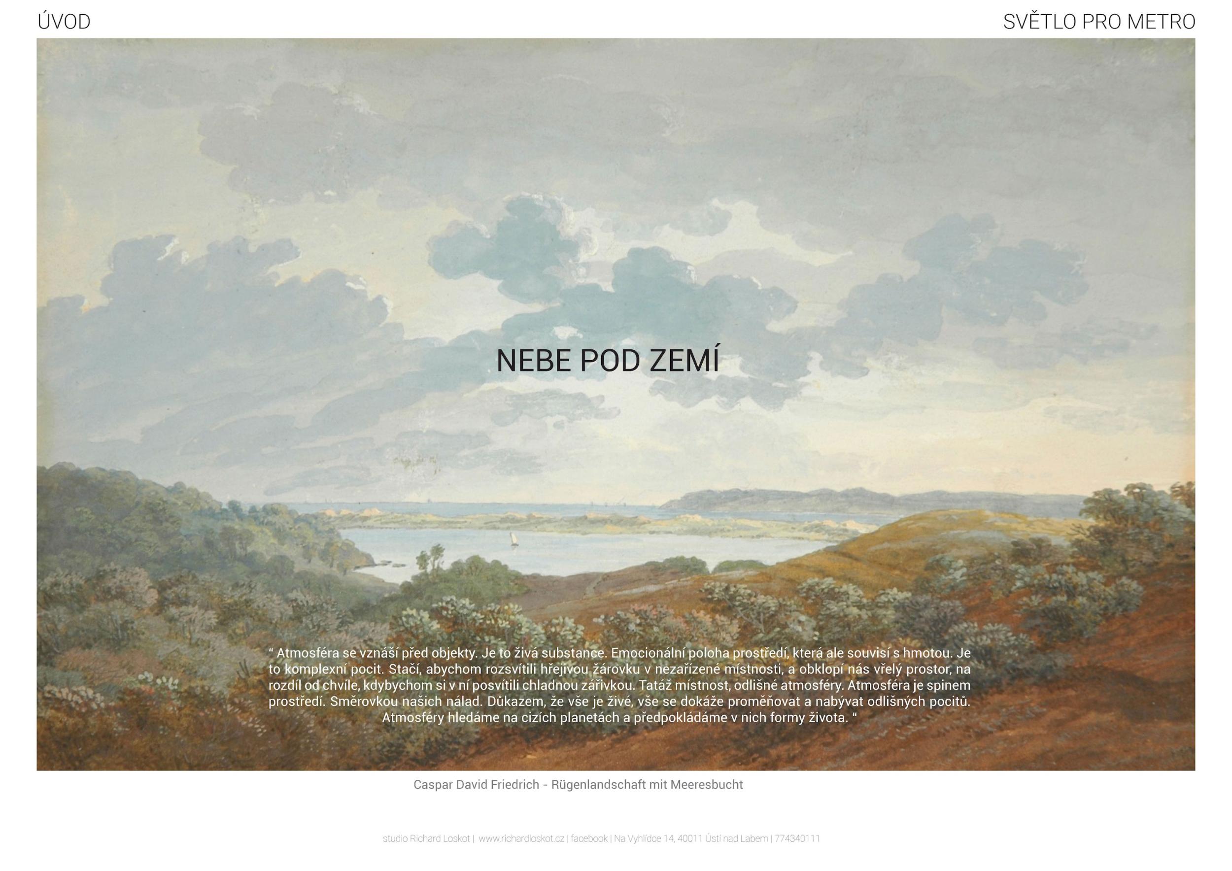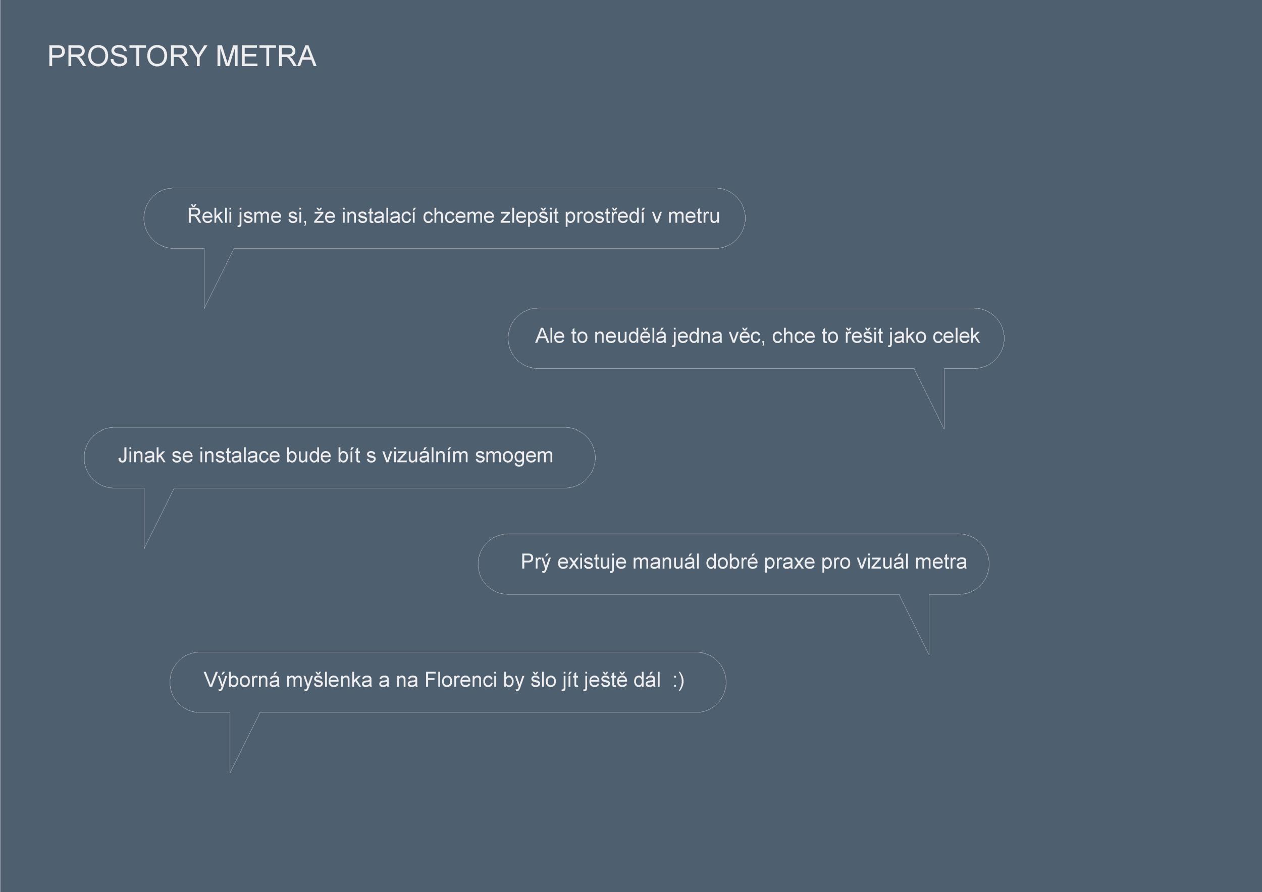 Stěžejním momentem pro náš nápad bylo střídání tmavého a světlého pochozího kamene, který tvoří opakující se rytmus pruhů, jenž prostor opticky natahují a vytvářejí zajímavou hru perspektivy. Zkoušeli jsme hledat dialog mezi pochozí plochou a podhledem. Jsou to dvě rozměrné roviny, které, vzhledem k jejich proporcím, si nejsou příliš vzdáleny a vytvářejí prostředí jakéhosi bazénu. I v něm, když jsme pod hladinou, se zrcadlí spodní prostor. Navrhujeme, aby podhled přijal čistou hru opakujících se linií. Hledali jsme obraz, který by přinesl do prostředí bez slunce něco z přirozeného světa. Fyzikálnost, která není technická, ale poetická. Za stálého osvětlení se na stropě budou zjevovat a generovat oblaka. Nebudou stále přítomna, jen v některých chvílích se postupně objeví, plynule se promění, v mírném pohybu se přeskupí a opět zmizí. Pohyb mraků má být plynulý. Video je jen ukázkou a je zrychlené. Pohyb je důležitou součástí instalace, která pomáhá kolemjdoucím pochopit záměr. Má však být nerušivý, spíše kontemplativní.