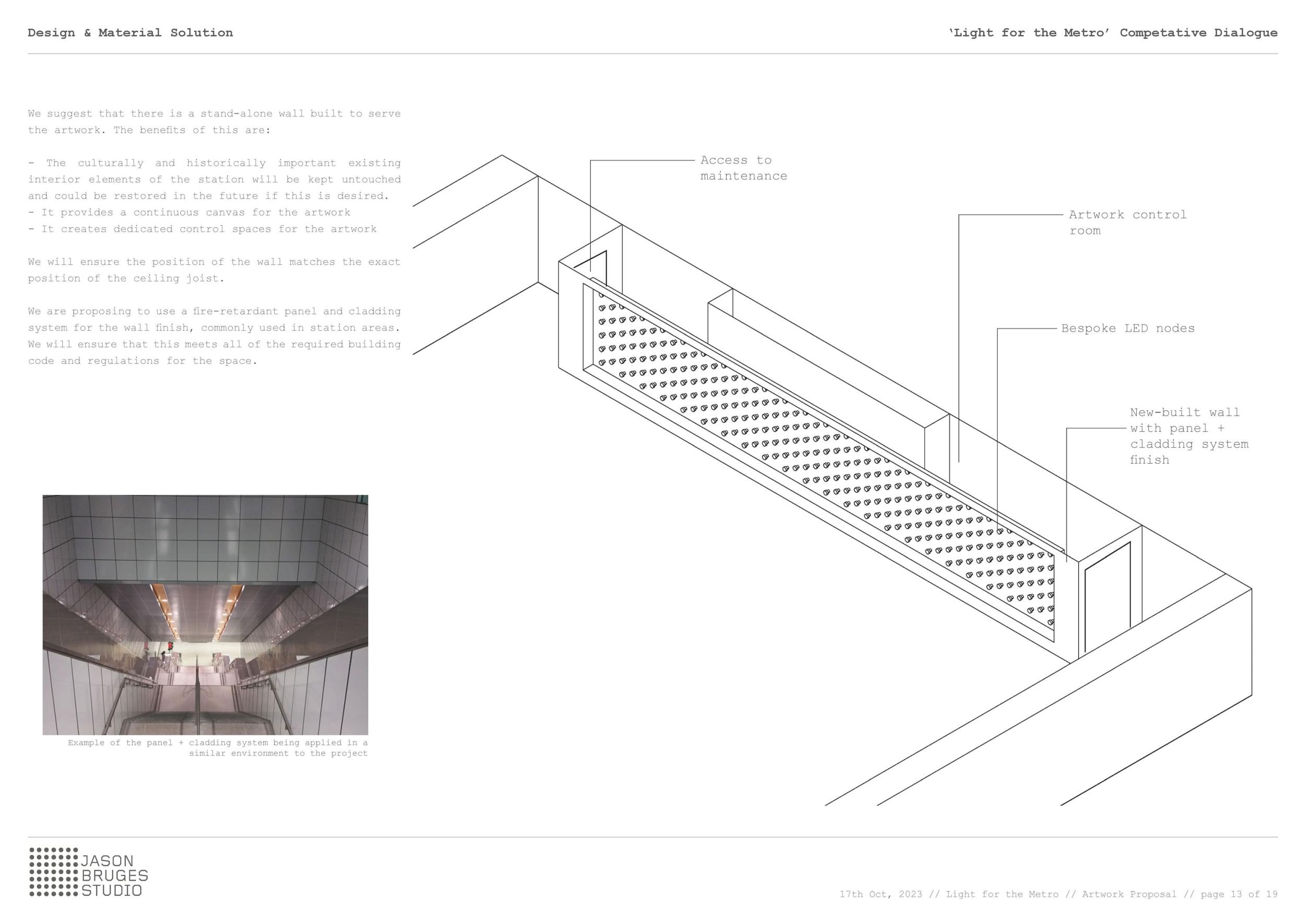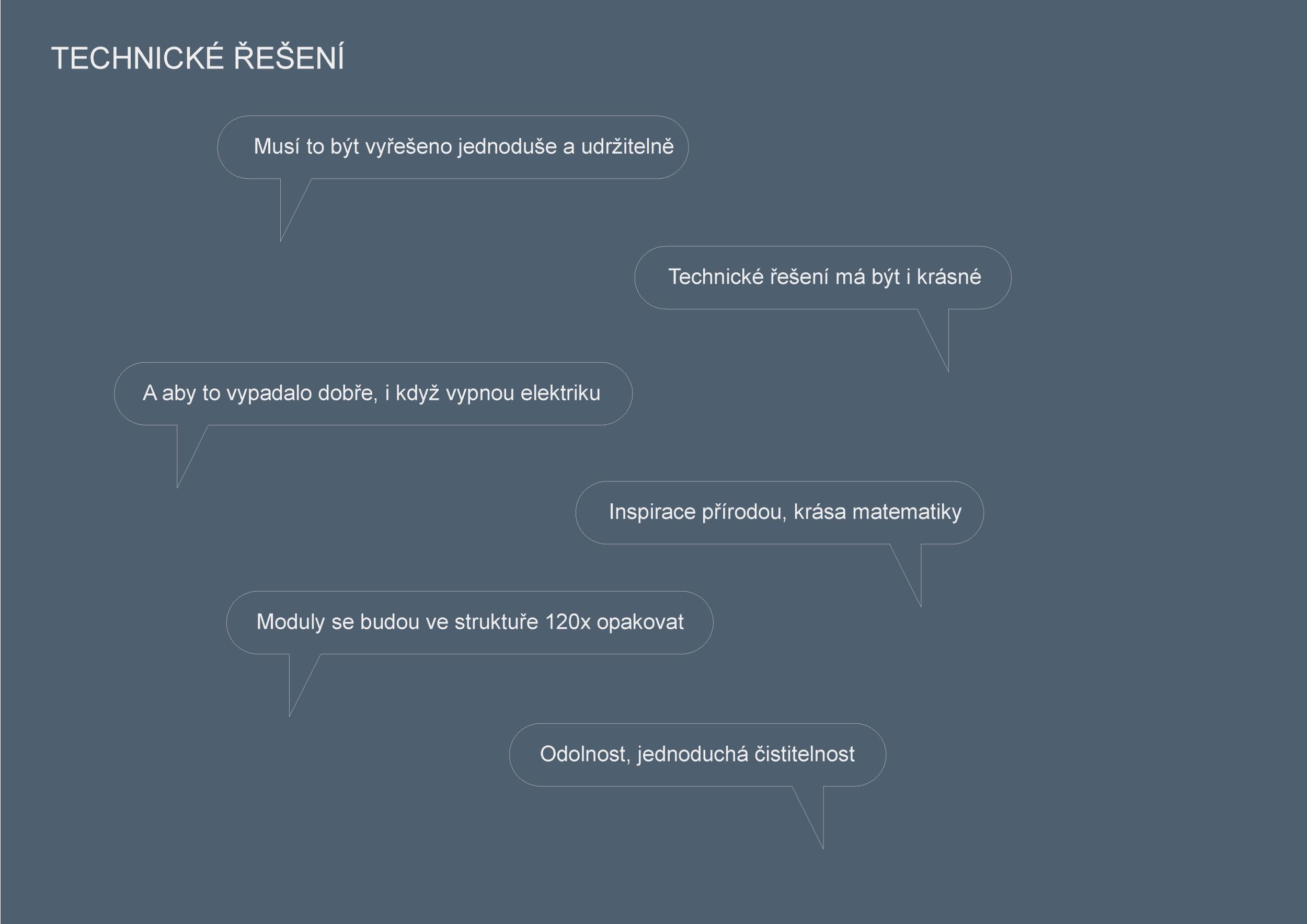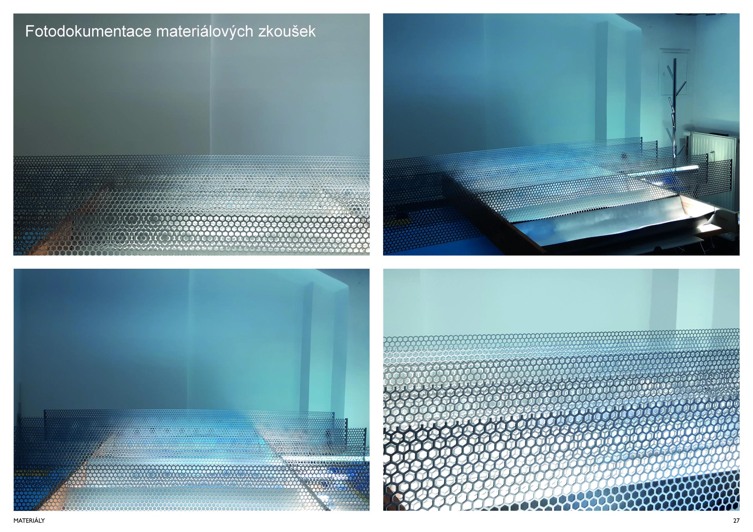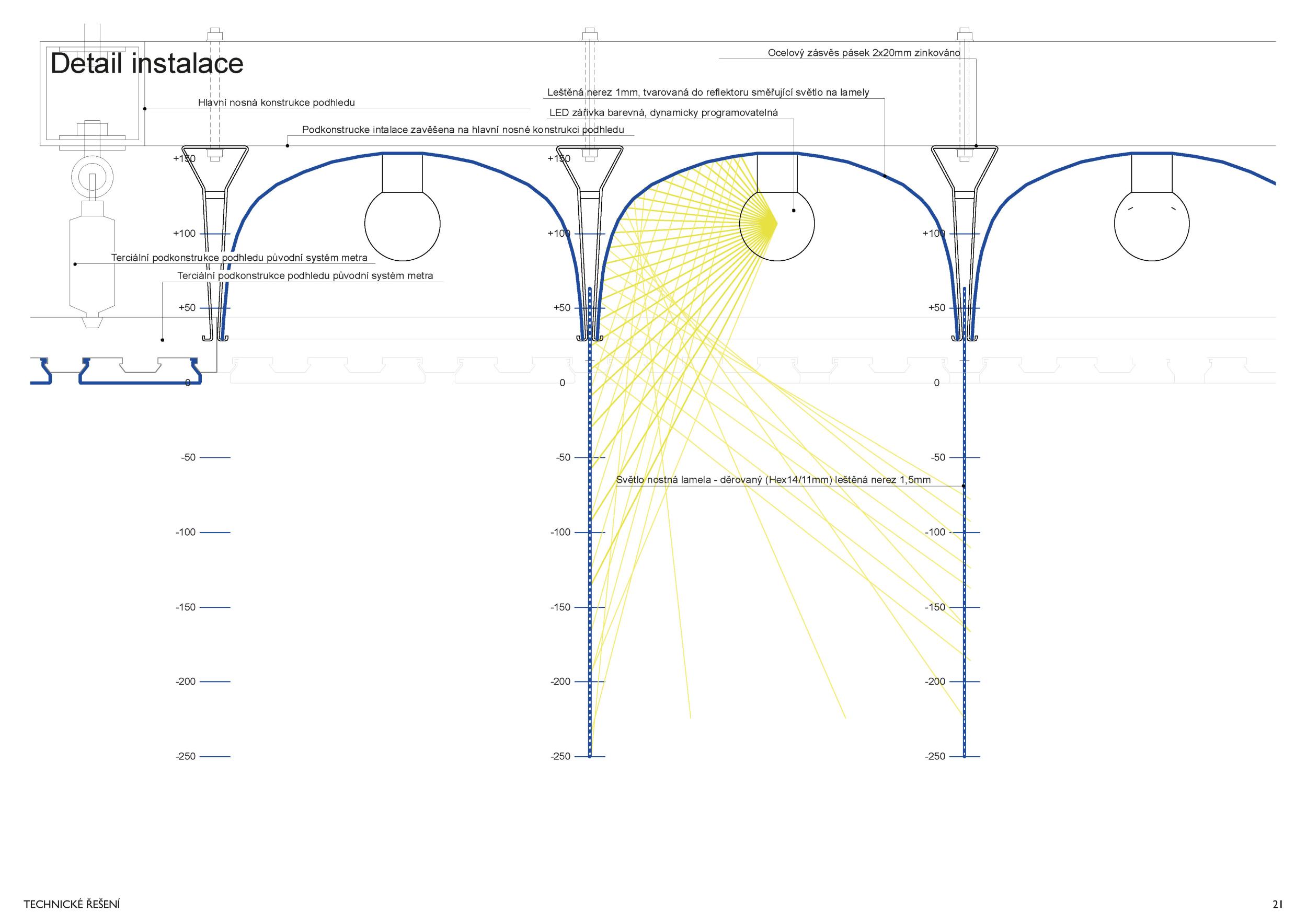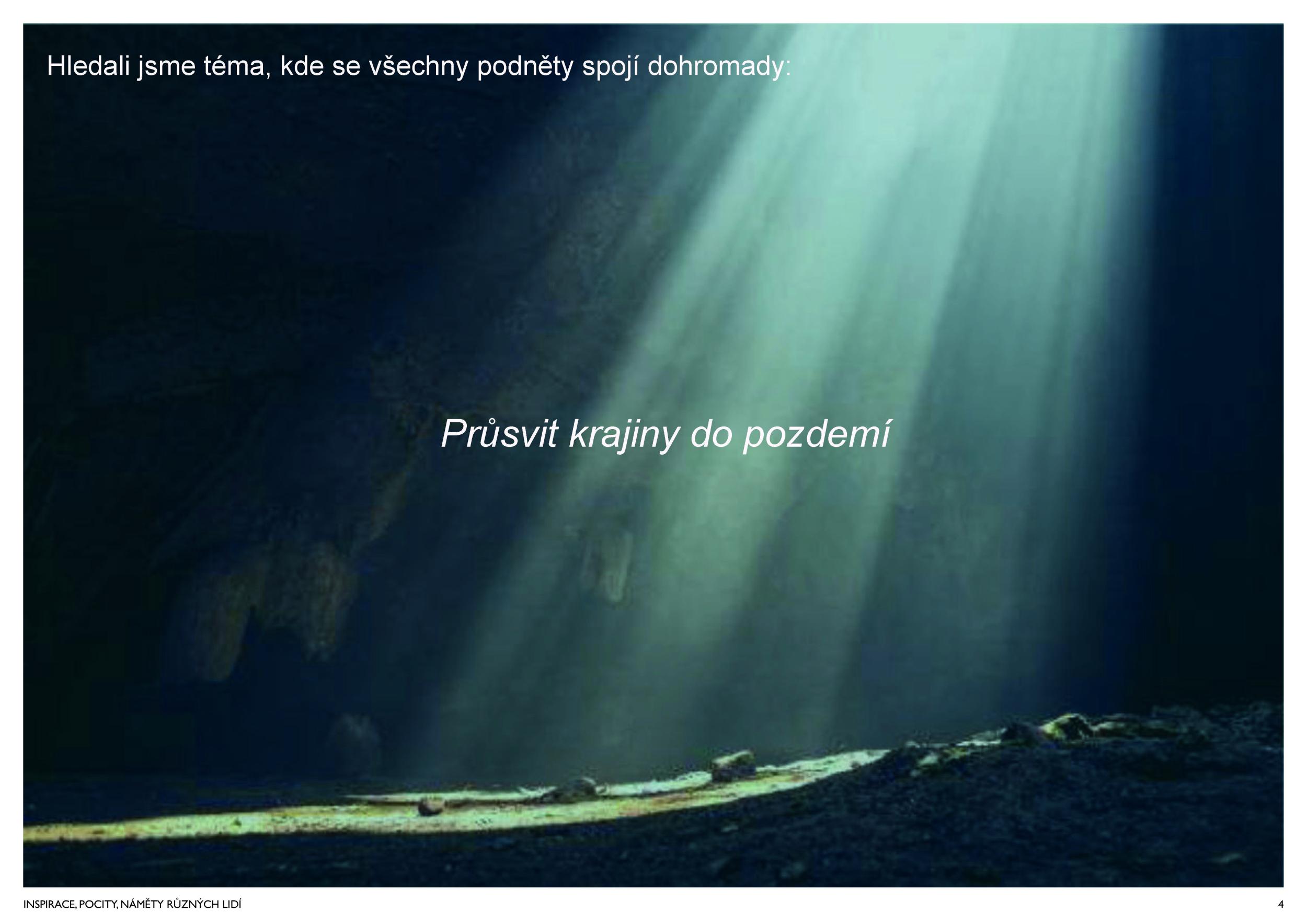 Stěžejním momentem pro náš nápad bylo střídání tmavého a světlého pochozího kamene, který tvoří opakující se rytmus pruhů, jenž prostor opticky natahují a vytvářejí zajímavou hru perspektivy. Zkoušeli jsme hledat dialog mezi pochozí plochou a podhledem. Jsou to dvě rozměrné roviny, které, vzhledem k jejich proporcím, si nejsou příliš vzdáleny a vytvářejí prostředí jakéhosi bazénu. I v něm, když jsme pod hladinou, se zrcadlí spodní prostor. Navrhujeme, aby podhled přijal čistou hru opakujících se linií. Hledali jsme obraz, který by přinesl do prostředí bez slunce něco z přirozeného světa. Fyzikálnost, která není technická, ale poetická. Za stálého osvětlení se na stropě budou zjevovat a generovat oblaka. Nebudou stále přítomna, jen v některých chvílích se postupně objeví, plynule se promění, v mírném pohybu se přeskupí a opět zmizí. Pohyb mraků má být plynulý. Video je jen ukázkou a je zrychlené. Pohyb je důležitou součástí instalace, která pomáhá kolemjdoucím pochopit záměr. Má však být nerušivý, spíše kontemplativní.