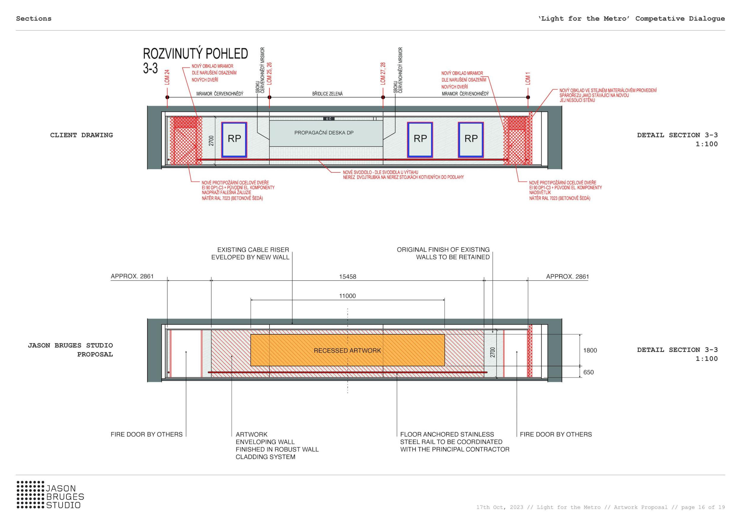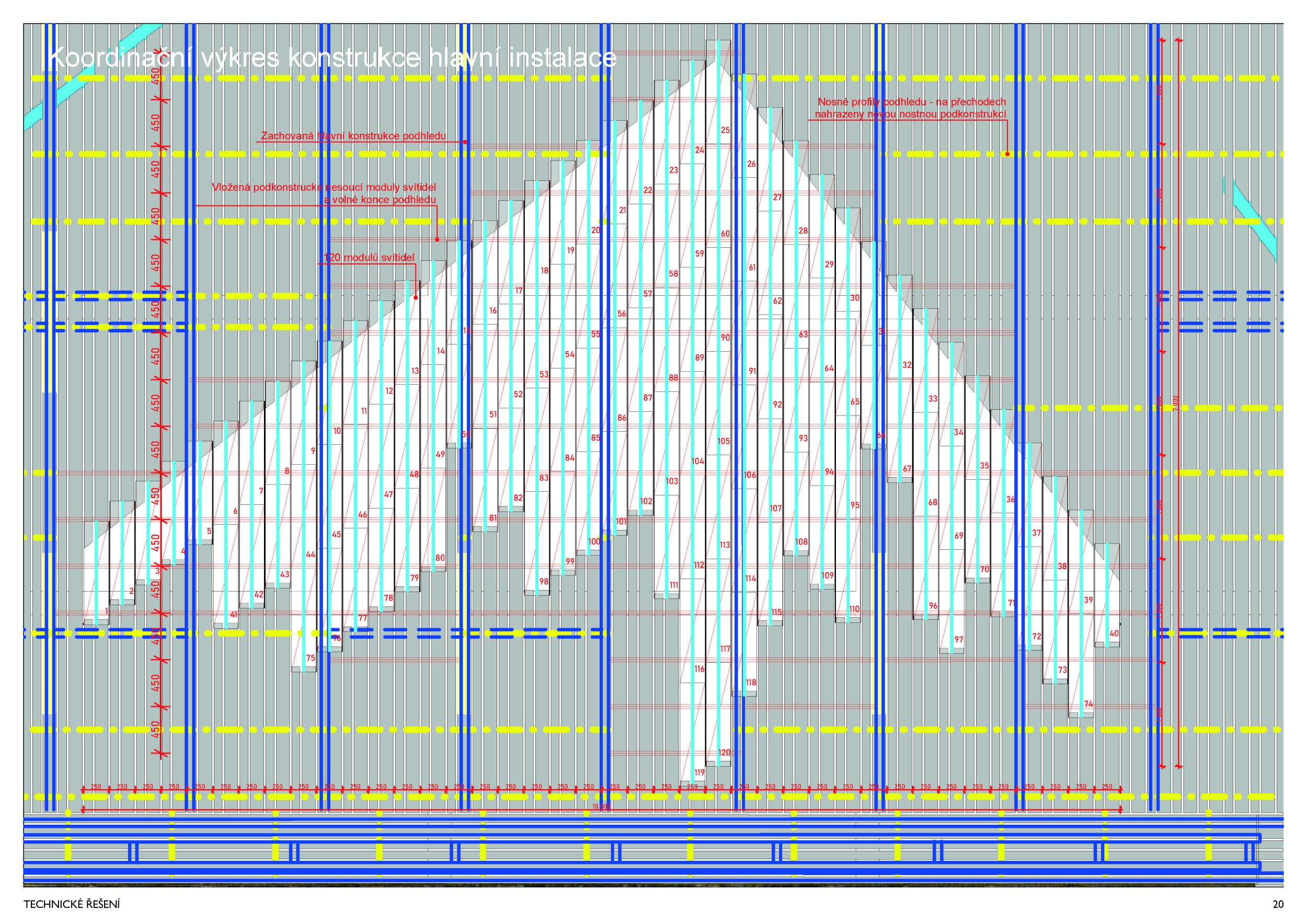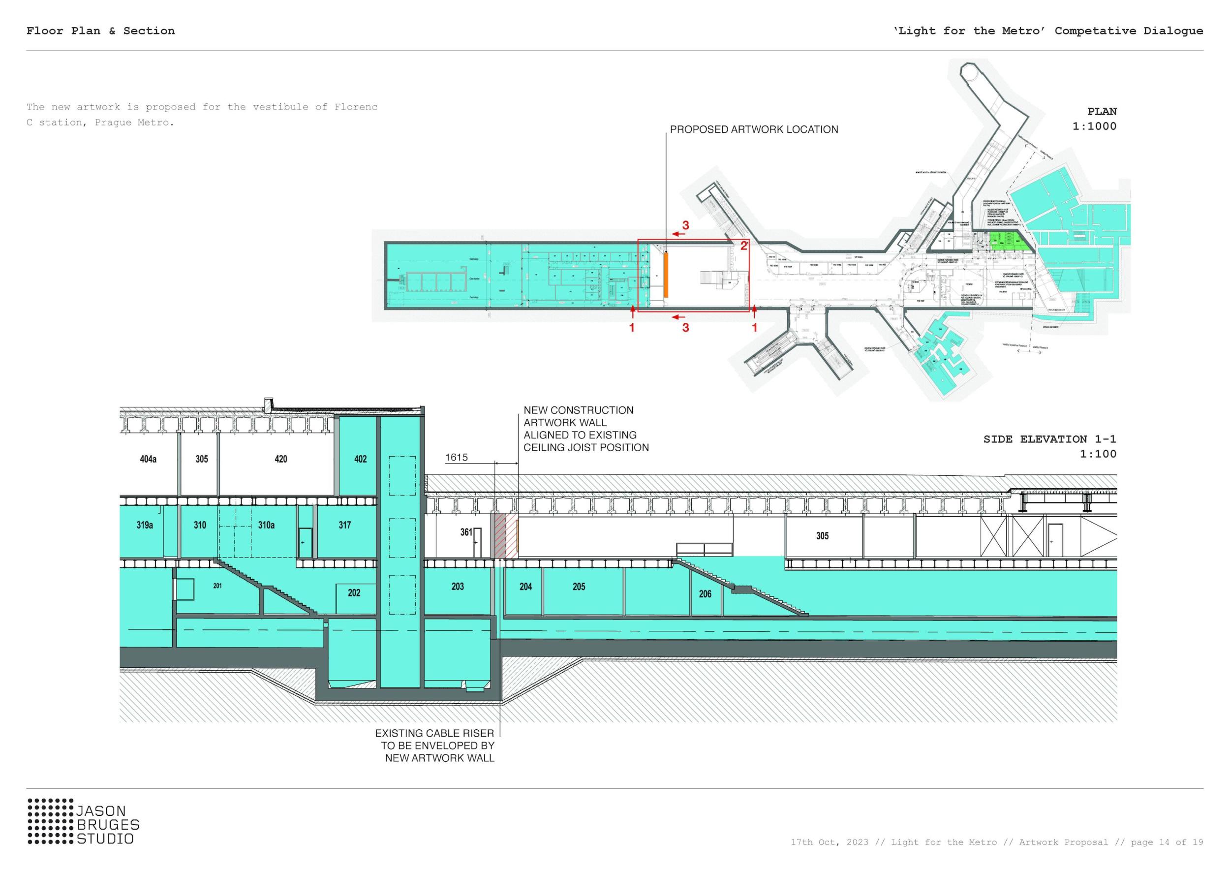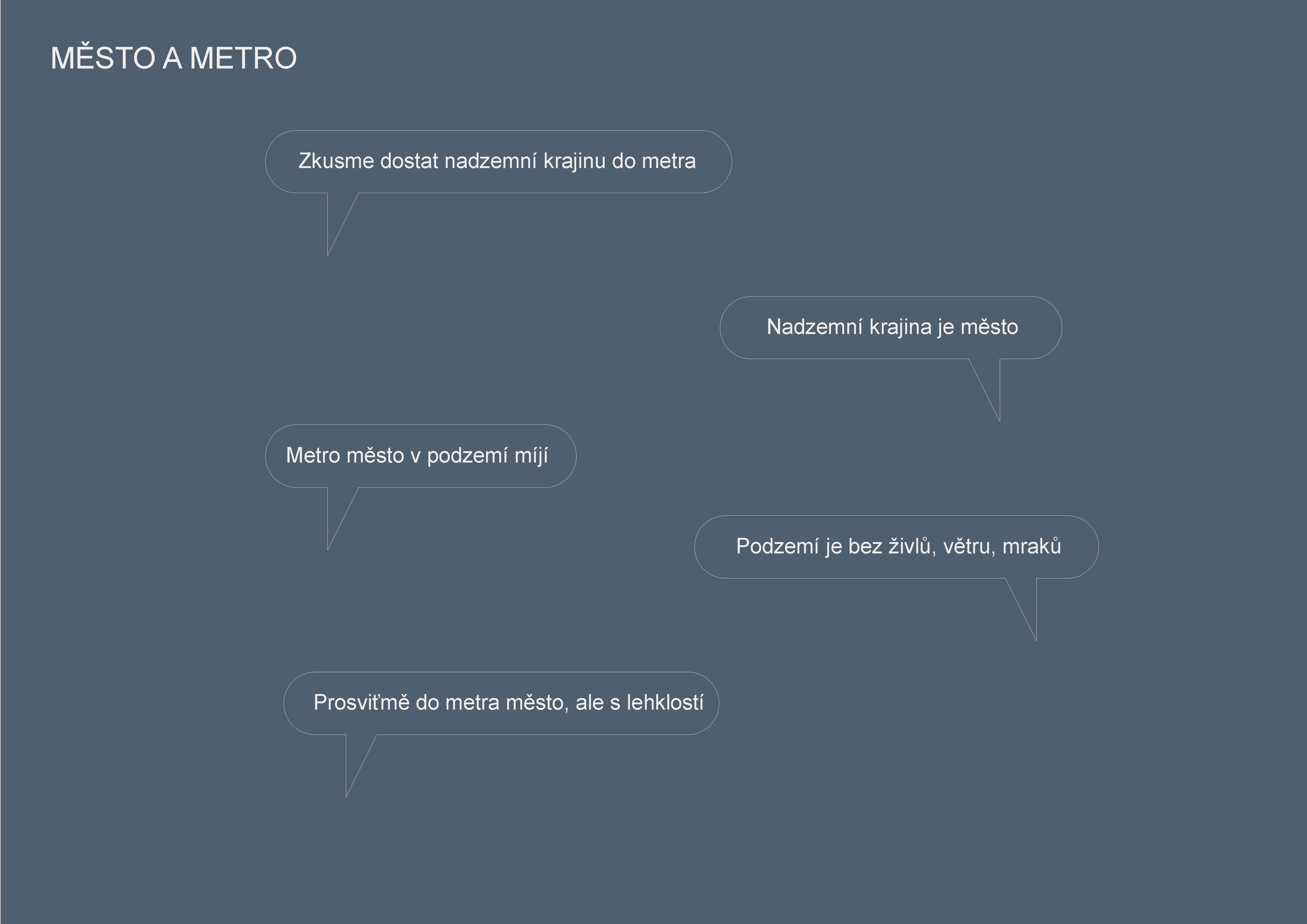 Stěžejním momentem pro náš nápad bylo střídání tmavého a světlého pochozího kamene, který tvoří opakující se rytmus pruhů, jenž prostor opticky natahují a vytvářejí zajímavou hru perspektivy. Zkoušeli jsme hledat dialog mezi pochozí plochou a podhledem. Jsou to dvě rozměrné roviny, které, vzhledem k jejich proporcím, si nejsou příliš vzdáleny a vytvářejí prostředí jakéhosi bazénu. I v něm, když jsme pod hladinou, se zrcadlí spodní prostor. Navrhujeme, aby podhled přijal čistou hru opakujících se linií. Hledali jsme obraz, který by přinesl do prostředí bez slunce něco z přirozeného světa. Fyzikálnost, která není technická, ale poetická. Za stálého osvětlení se na stropě budou zjevovat a generovat oblaka. Nebudou stále přítomna, jen v některých chvílích se postupně objeví, plynule se promění, v mírném pohybu se přeskupí a opět zmizí. Pohyb mraků má být plynulý. Video je jen ukázkou a je zrychlené. Pohyb je důležitou součástí instalace, která pomáhá kolemjdoucím pochopit záměr. Má však být nerušivý, spíše kontemplativní.