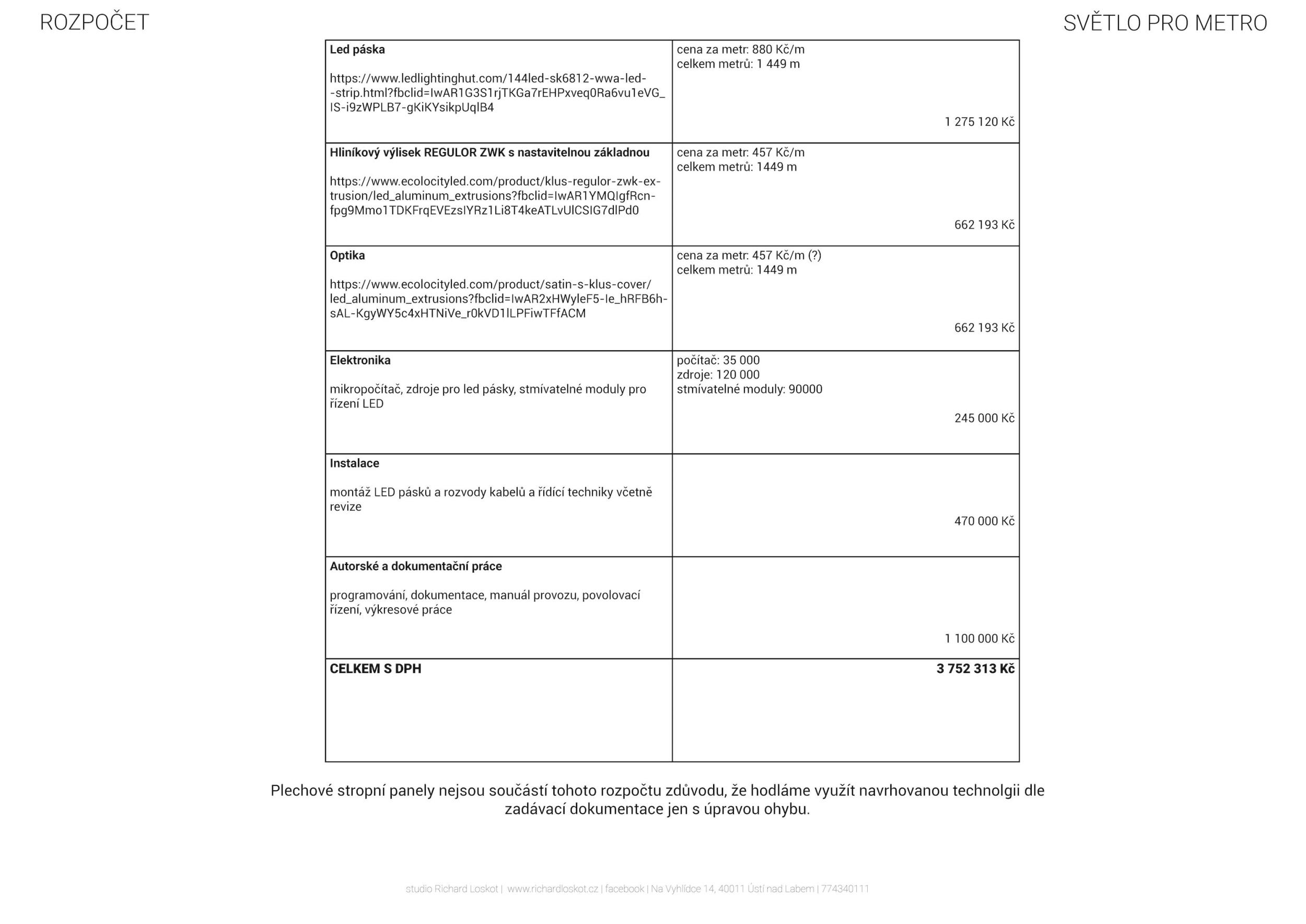 Komise hodnotí velice kladně celistvost a velkorysost silného uměleckého záměru, obzvláště zahrnutí maximálního možného prostoru coby rámce působení díla a ztvárnění poetiky vztahu vnějšího světa k jinak utilitárnímu přestupnímu místu bez možnosti kontaktu s rytmem a efektem denního světla. Kvitován byl také značný vývoj díla od prve představeného konceptu ke konečnému výsledku. Umělecká a prostorová kvalita byla v tomto návrhu dle názoru komise nejvyšší a řešené místo by velice obohatila. Navržené technické parametry řešení nejsou popsané do hlubšího detailu a realizovatelnost tak do značné míry zůstala pouze na představivosti komise a přizvaných odborníků. Velkou nejistotu vzbuzovala možná ne/viditelnost navrhovaného řešení při spolupůsobení stabilního osvětlení, tedy zda dílo v prostoru skutečně vynikne. Předložený detail stropních lamel představuje velmi křehké technické řešení, navíc problematické nejen na svou vlastní údržbu ale i na údržbu technologií metra. Celkové náklady jsou dle názoru komise zcela nereálné. Vzhledem k nutnosti dopracování návrhu (ačkoli je to předpokladem u všech návrhů) a zejména vzhledem k nutnosti uvedení do souladu se všemi normami a požadavky na bezpečnost a údržbu by, dle názoru komise, investiční náklady narostly i několikanásobně.