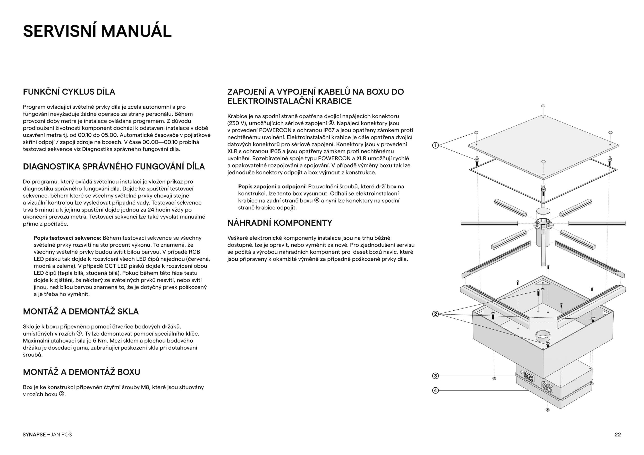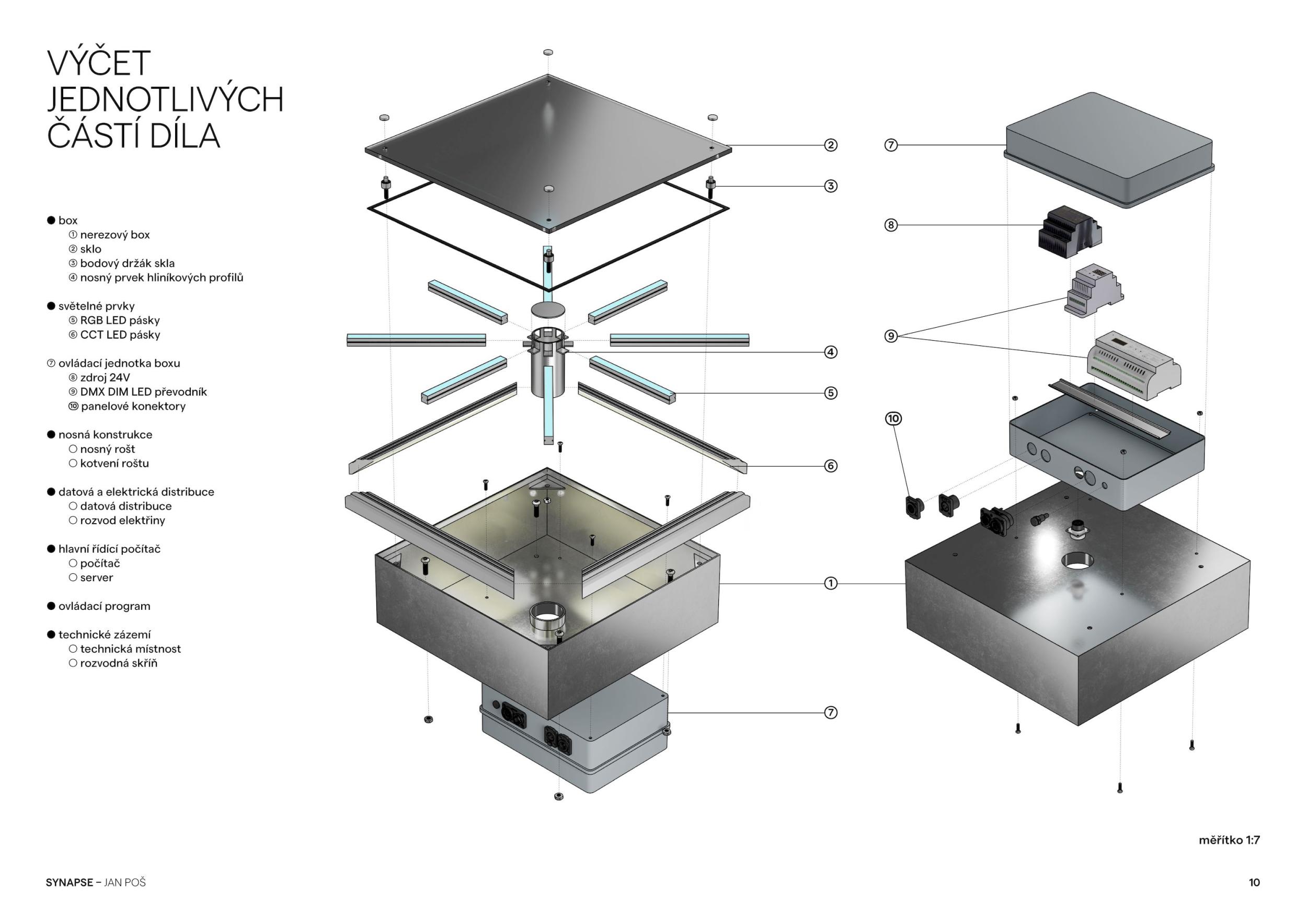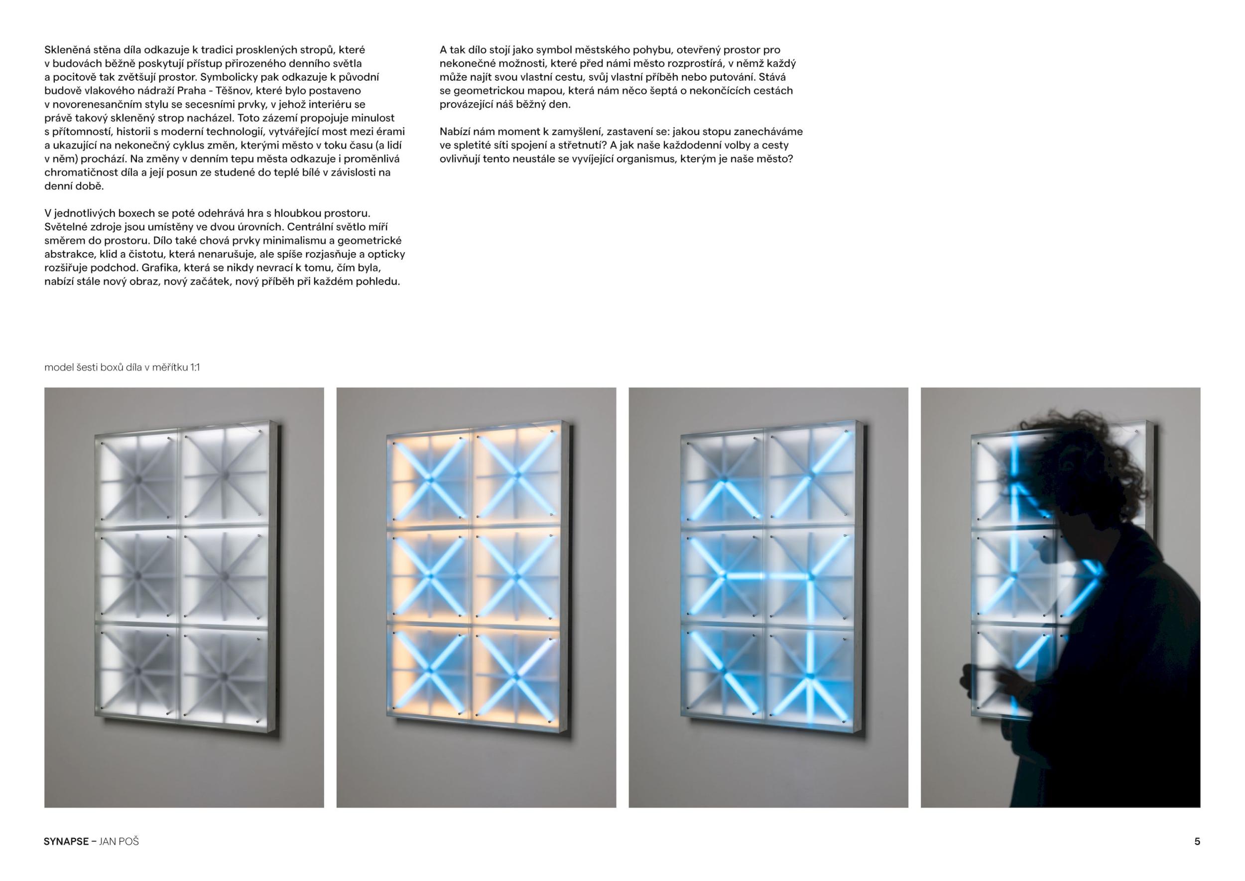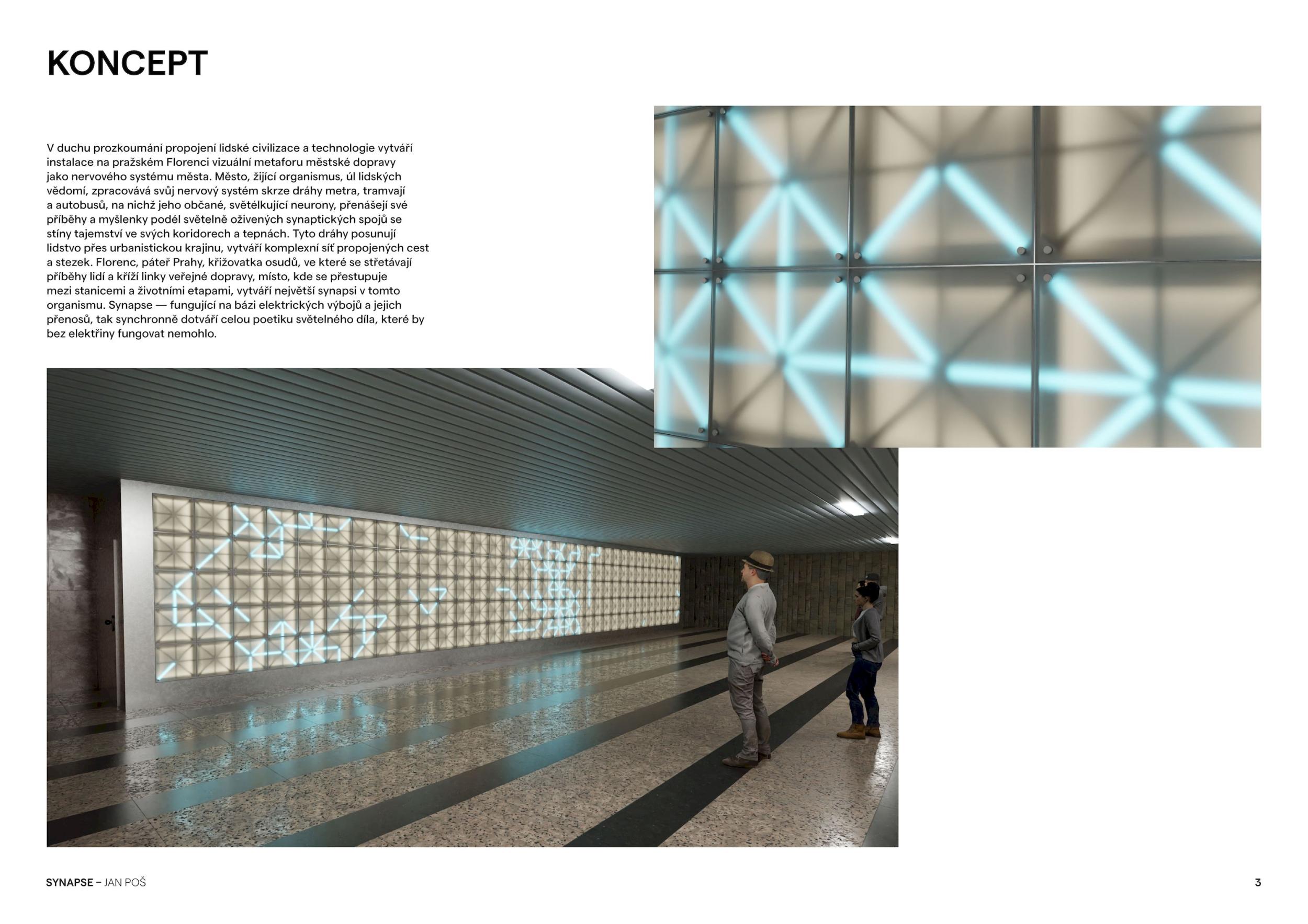 V duchu prozkoumání propojení lidské civilizace a technologie vytváří instalace na pražském Florenci vizuální metaforu městské dopravy jako nervového systému města. Město, žijící organismus, úl lidských vědomí, zpracovává svůj nervový systém skrze dráhy metra, tramvají a autobusů, na nichž jeho občané, světélkující neurony, přenášejí své příběhy a myšlenky podél světelně oživených synaptických spojů se stíny tajemství ve svých koridorech a tepnách. Tyto dráhy posunují lidstvo přes urbanistickou krajinu, vytváří komplexní síť propojených cest a stezek. Florenc, páteř Prahy, křižovatka osudů, ve které se střetávají příběhy lidí a kříží linky veřejné dopravy, místo, kde se přestupuje mezi stanicemi a životními etapami, vytváří největší synapsi v tomto organismu. Synapse — fungující na bázi elektrických výbojů a jejich přenosů, tak synchronně dotváří celou poetiku světelného díla, které by bez elektřiny fungovat nemohlo.