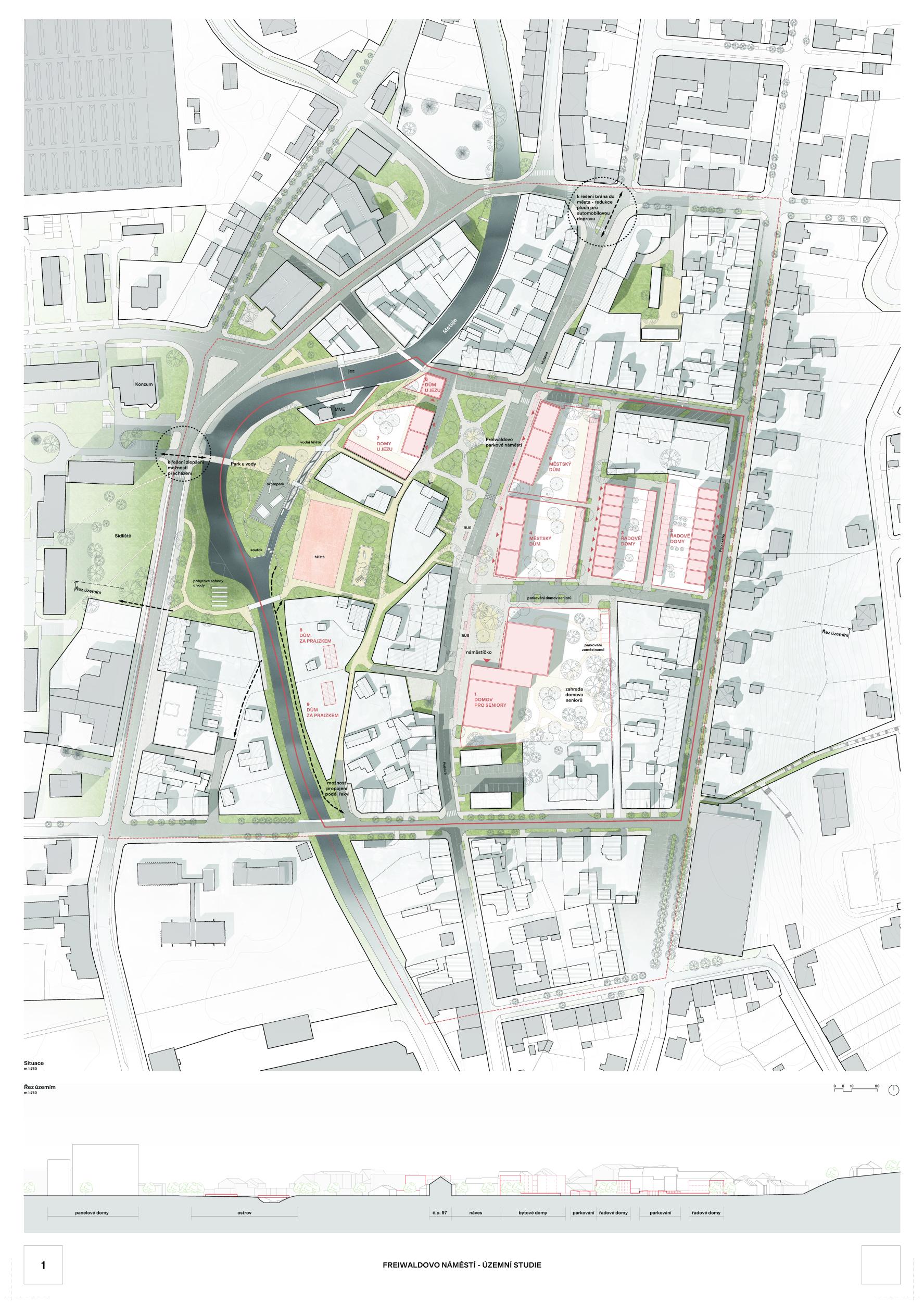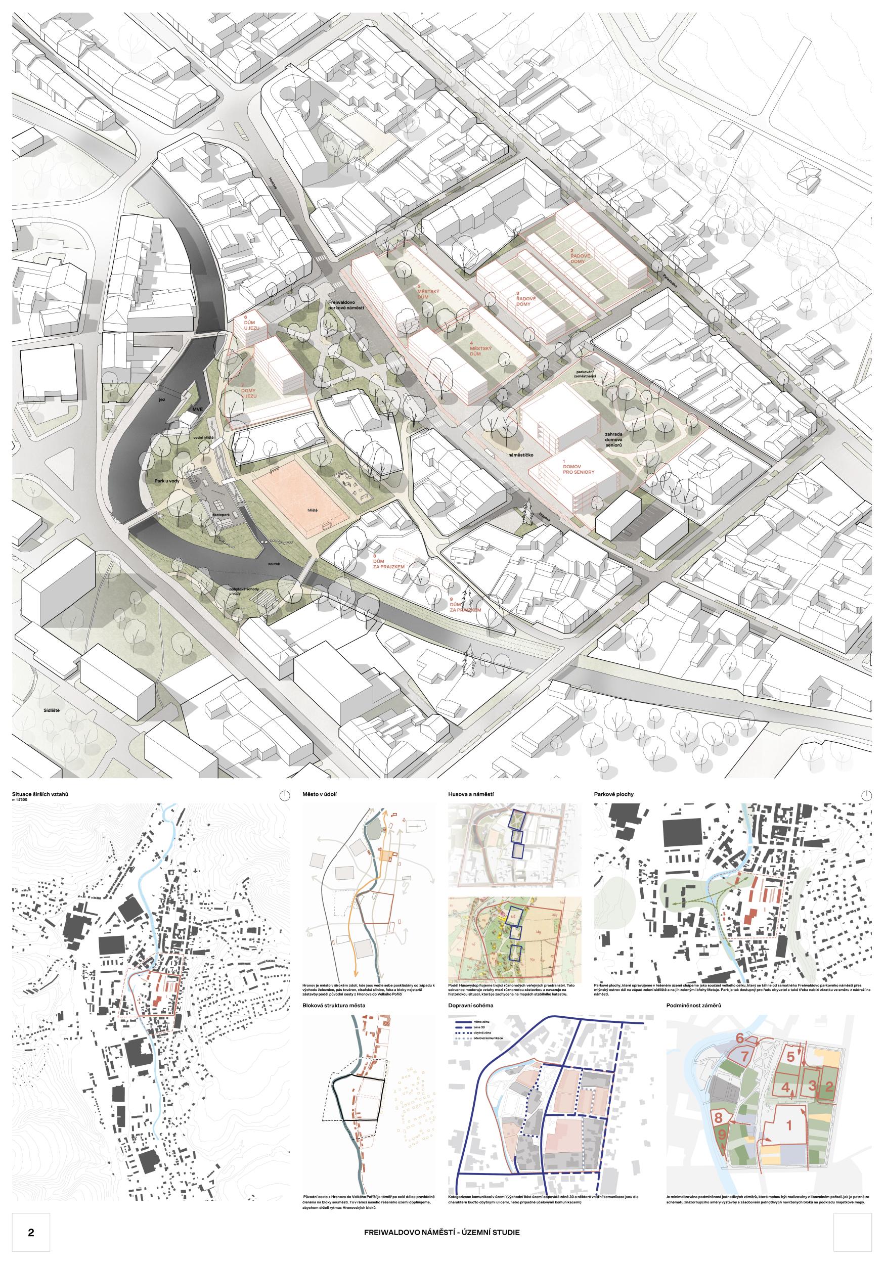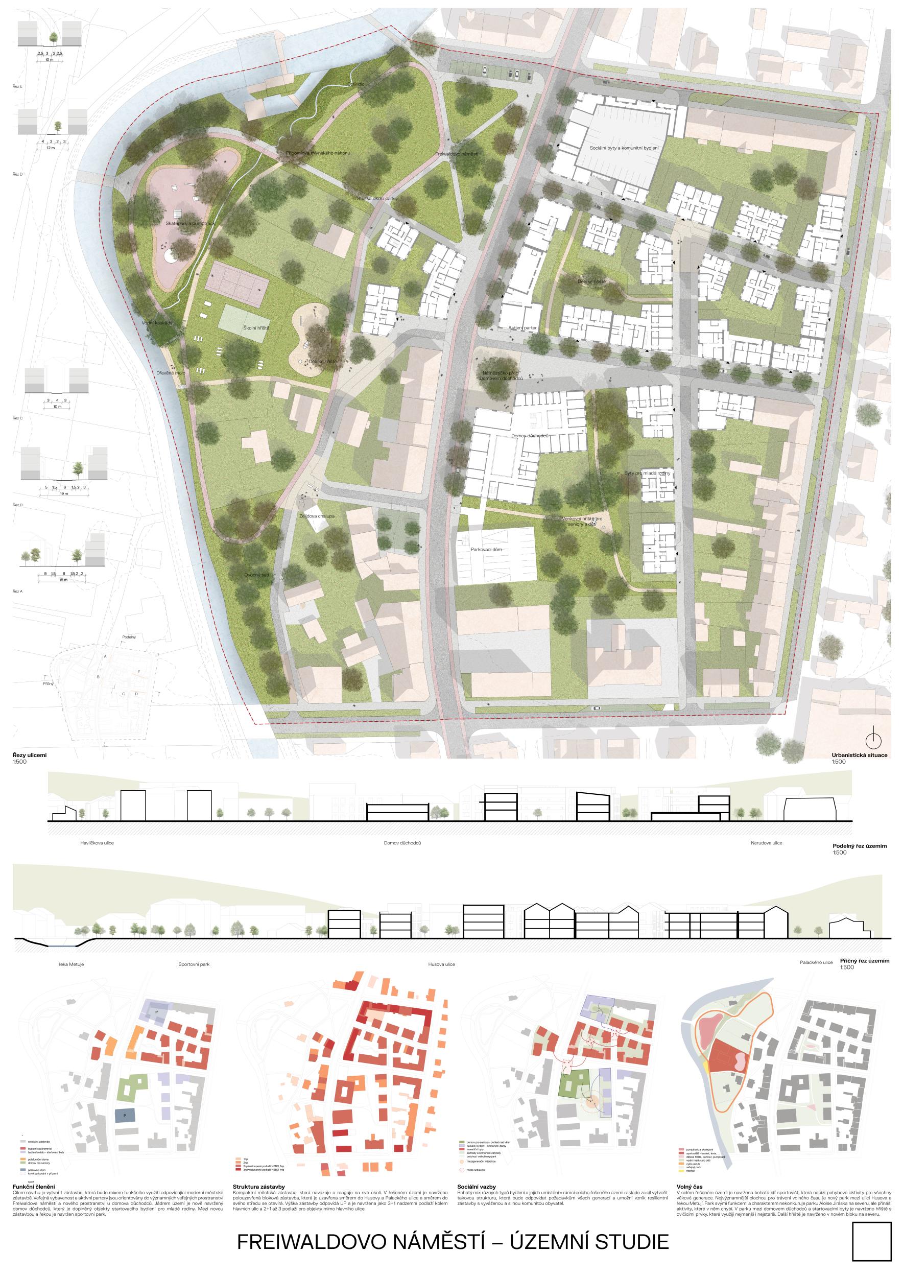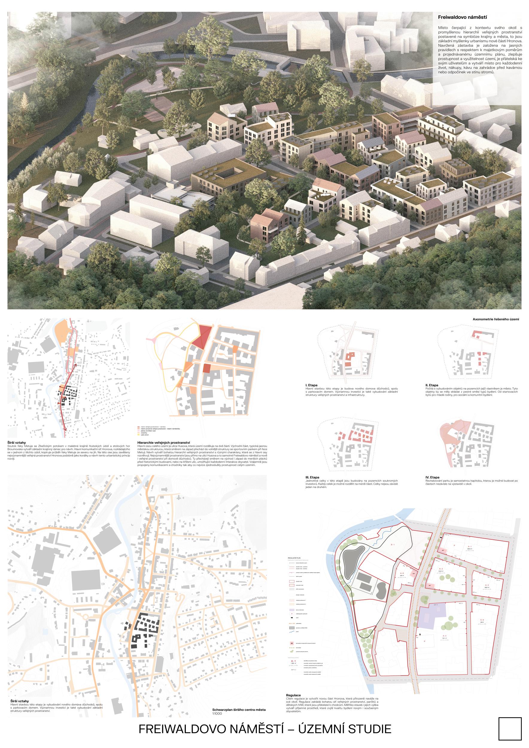 Freiwaldovo náměstí obklopuje ze západu park, z jihovýchodu vesnická zástavba chalup, ze severu město vznosných domů, z východu vilková zástavba. Středem území pak prochází jeho osa původní cesta z Hronova do Velkého Poříčí. Všechny tyto typologie dávají ve městě smysl a to i v měřítku pár bloků řešeného území, kde je v návrhu různým způsobem rozvíjíme pro dnešní situaci. Okolo Freiwaldova náměstí tak vznikne bydlení pro seniory, městské řadové domy pro rodinné bydlení, bytové domy umožňující diverzitu bydlení (velikost, vlastnická forma) a s živým parterem v nejexponovanějších místech, park nejen s hřišti pro děti a teenagery a celkově město prostupné pro všechny.