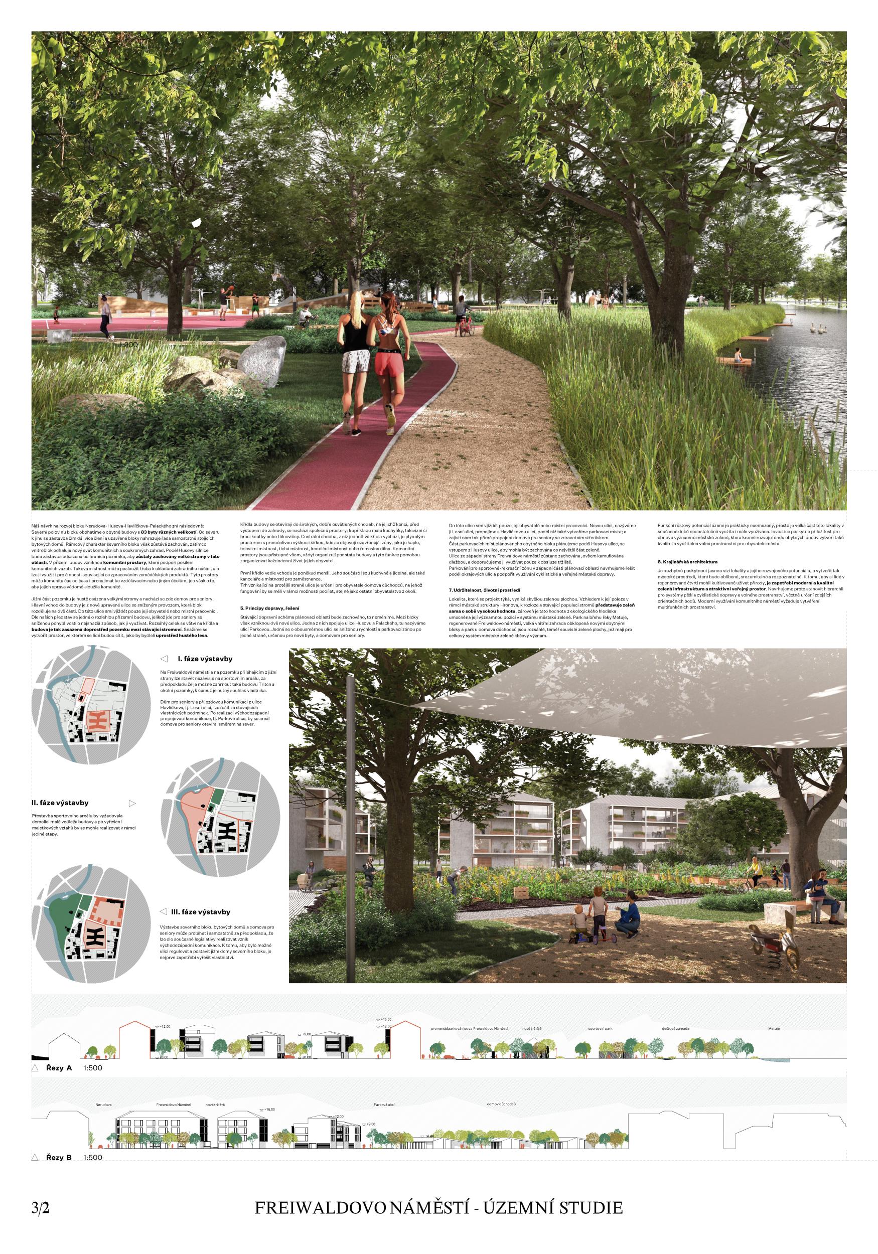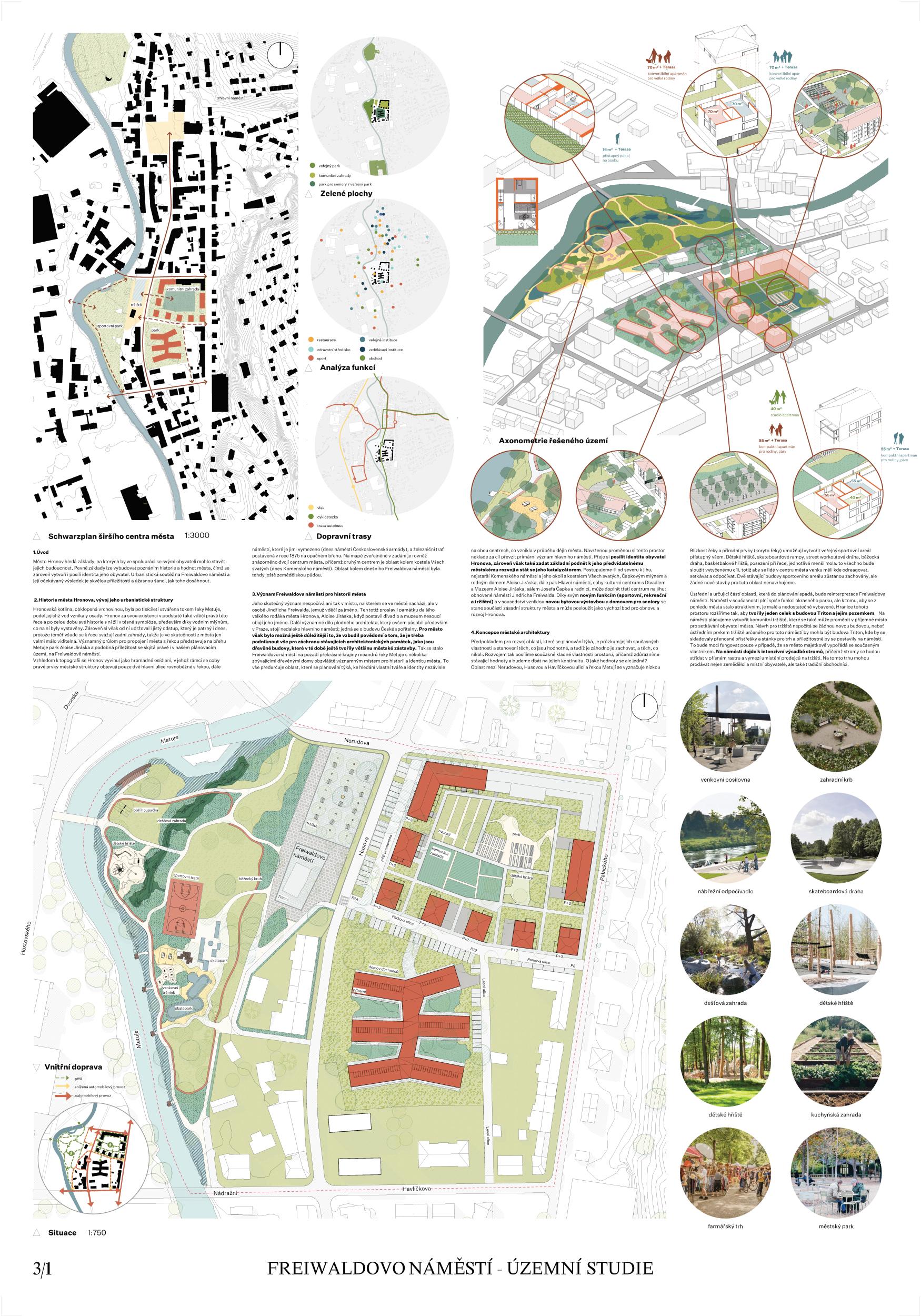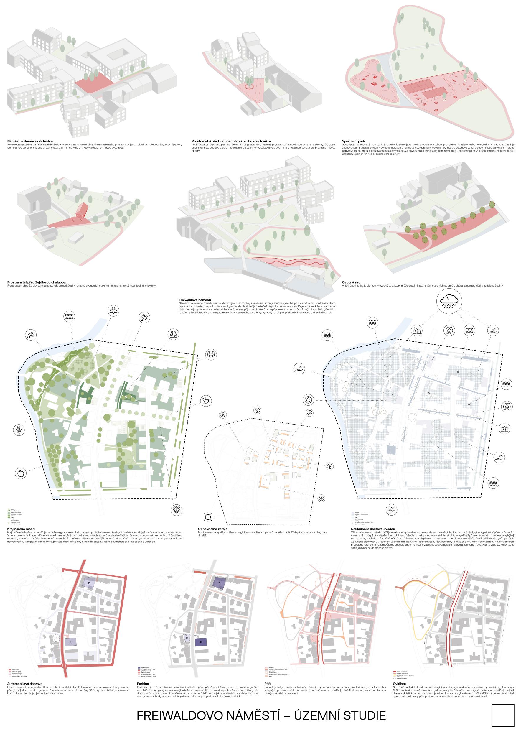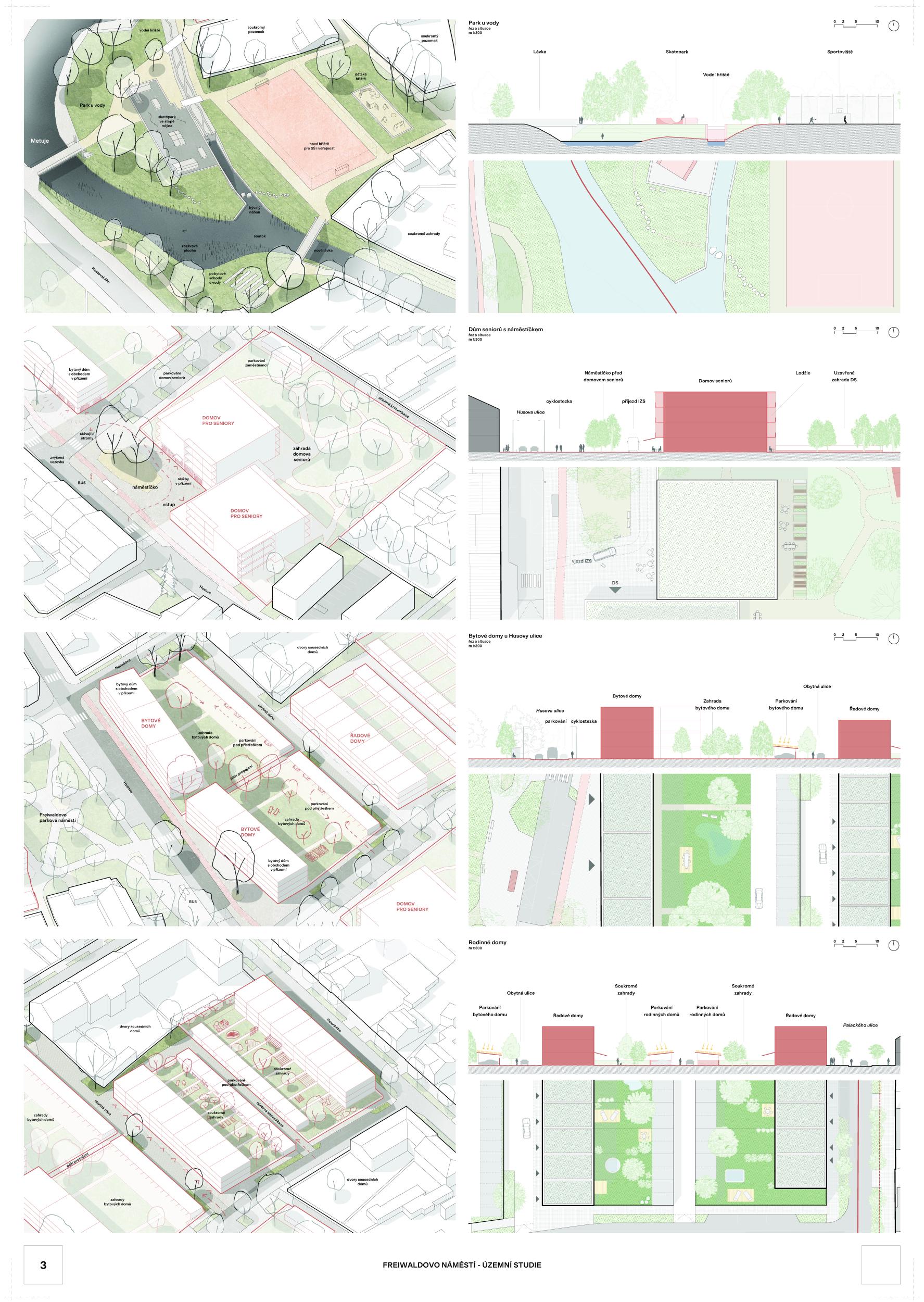 Freiwaldovo náměstí obklopuje ze západu park, z jihovýchodu vesnická zástavba chalup, ze severu město vznosných domů, z východu vilková zástavba. Středem území pak prochází jeho osa původní cesta z Hronova do Velkého Poříčí. Všechny tyto typologie dávají ve městě smysl a to i v měřítku pár bloků řešeného území, kde je v návrhu různým způsobem rozvíjíme pro dnešní situaci. Okolo Freiwaldova náměstí tak vznikne bydlení pro seniory, městské řadové domy pro rodinné bydlení, bytové domy umožňující diverzitu bydlení (velikost, vlastnická forma) a s živým parterem v nejexponovanějších místech, park nejen s hřišti pro děti a teenagery a celkově město prostupné pro všechny.