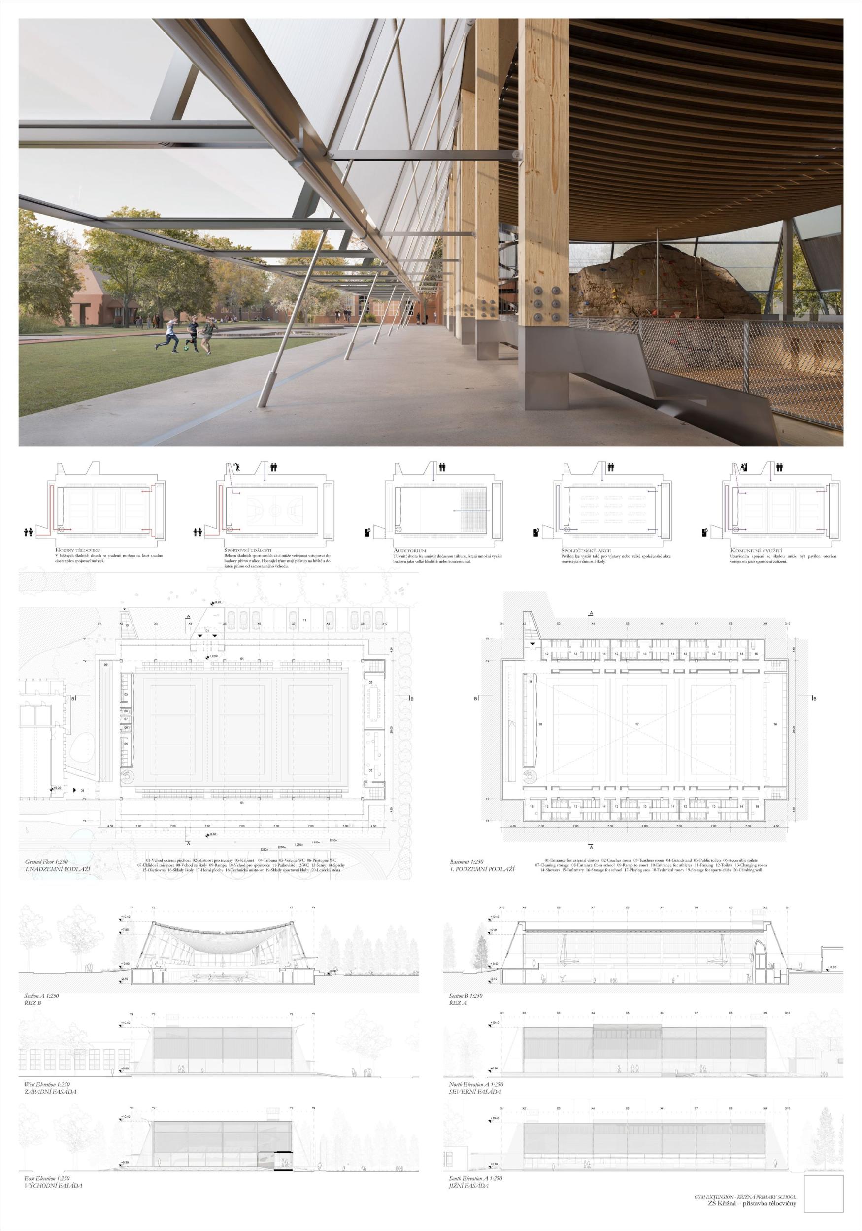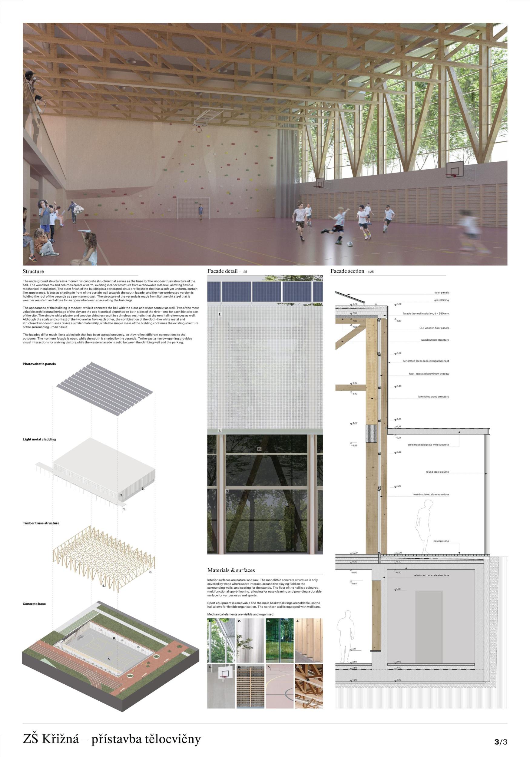 Návrh umisťuje objekt sportovní haly do pozice za jídelnou. Toto umístění bylo voleno často, protože zachovává krajinářsky důležitý prostor se vzrostlými stromy před jídelnou a novou sportovní halou. Přináší však s sebou problém, jak nový objekt napojit „suchou nohou“ na stávající budovy školy. Jeho řešení je v tomto projektu elegantní – prosklenou arkádou, která je ladně napojena na hmotu tělocvičny. Porota vysoce cení vizuální i funkční propojení vnitřní sportovní plochy s venkovní sportovní plochou, která na objekt přímo navazuje. Tímto propojením vzniká vynikající sportovně funkční prostředí. Návrh harmonicky pracuje se stávajícími i nově navrženými stromy a vytváří příjemný venkovní prostor. Autoři se rozhodli objekt nezapustit do země a zároveň navrhli sportovní halu s minimální doporučenou výškou. Tato dvě rozhodnutí vedou k hmotově a technicky ekonomickému řešení, které je dle názoru poroty vhodnou odpovědí na zadání. Porota vysoce hodnotí čistotu návrhu konstrukce tvořené kombinací štíhlých betonových sloupů a dřevěných nosníků jako hlavního konstrukčního prvku. Pochybnosti u poroty vzbudila jižní fasáda, která působí lehce a krásně, ale nepřesvědčivě ve smyslu dostatečného zastínění. Druhou pochybností poroty byl vztah navrhované stavby k ulici Křižná, kde je sice logicky umístěn hlavní vstup do budovy pro veřejnost, ale zbytek fasády je slepá stěna šaten. Je to cena, kterou autoři platí za rozhodnutí šatny nezapouštět pod zem.