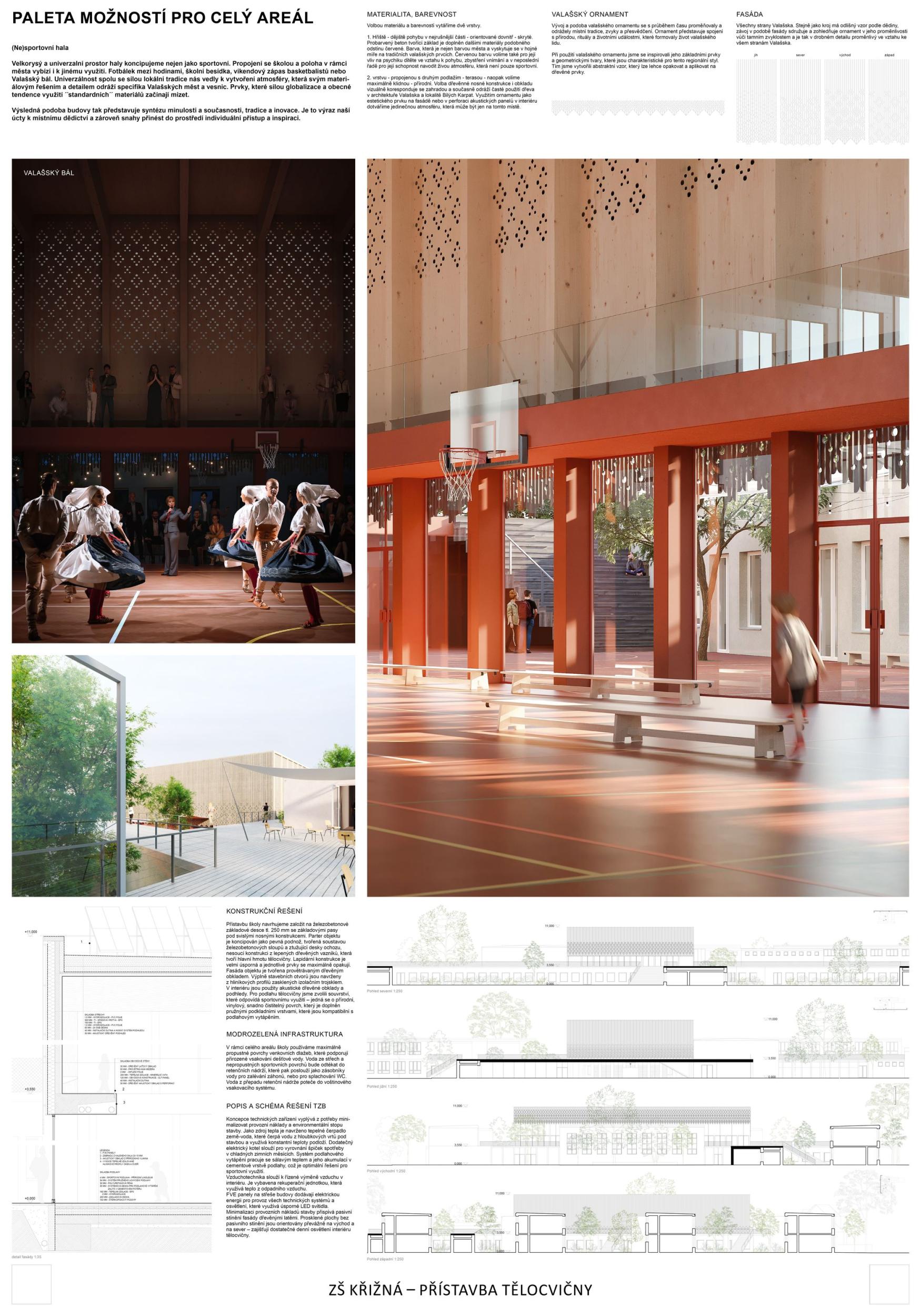 Návrh přináší změnu do celého areálu Základní školy Křižná. Umístěním sportovní haly přímo uprostřed dispozice vzniká široká paleta příležitostí a nových potenciálů, jak z poměrně zastaralé budovy s mnoha nepřehlednými koridory udělat funkční a moderní celek. Najednou vidíte jinou školu, která obstojí ve srovnání s novými budovami. Hlavním potenciálem návrhu je tak změna, která se nevyhýbá řešení stávajících problémů. Tento návrh dostavby tělocvičny jako jediný dokázal zachovat hřiště i zahradu se vzrostlými stromy a dává tímto rozhodnutím slušný prostor pro kultivované krajinářské řešení, které je v této fázi nabídnuto pouze v náznacích, které ovšem mají svou logiku. Návrh umožňuje i postupnou realizaci a je ke stávajícím stromům citlivý. Zpřístupnění střech je velice důležitou částí projektu a velká změna pro školu s doposud převládajícím vnitřním pohybem žáků. Dalším potenciálem návrhu je tak i práce se všemi koridory a zásadní zlepšení vnitřního prostředí pro žactvo, které se doposud pohybovalo v nepřehledných koridorech. Tato změna stávajícího stavu se logicky propíše do šaten, jídelny a může také lépe definovat vstup a vestibul školy. Umístění funkcí, jako je knihovna, počítačová učebna, družina, by mělo tuto změnu rovněž následovat a podpořit tak celkový koncept na vytvoření srdce Základní školy Křižná. Návrh má tak obrovskou přidanou hodnotu – do maximální míry využít a zlepšit stávající areál v moderní pulzující celek s kvalitním vnitřním i venkovním prostředím, které inspiruje budoucí generace.