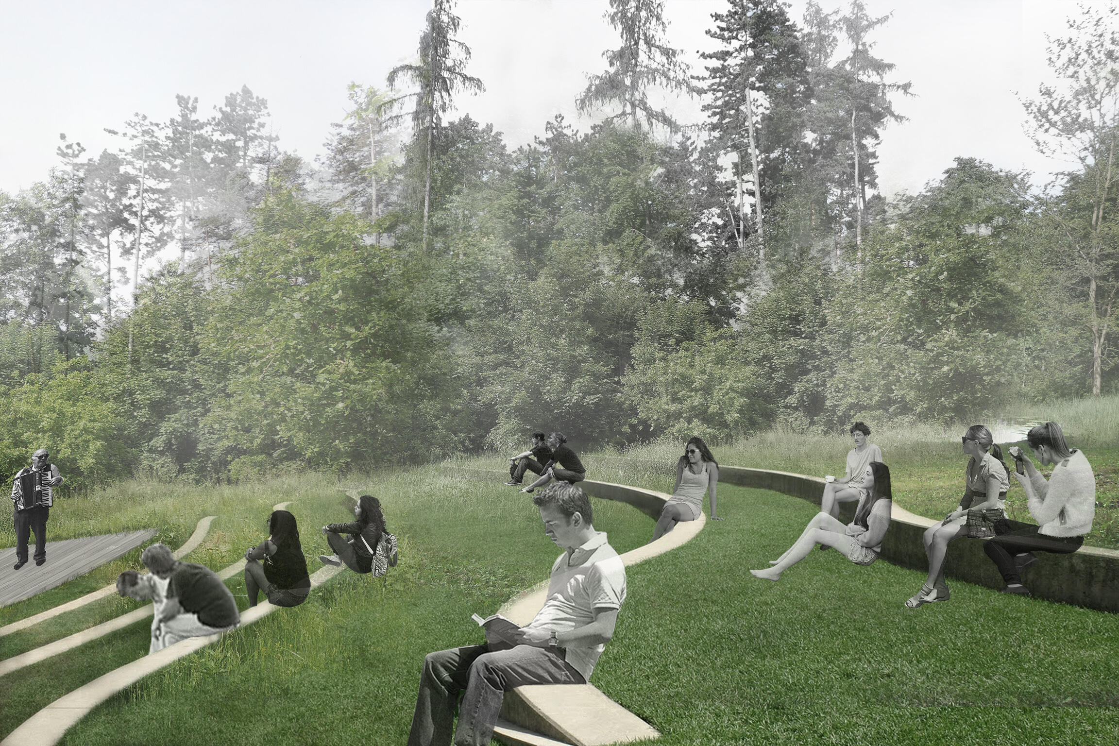Věříme, že se lesopark stane atraktivním místem pro obyvatele Vodňan i širšího okolí, a to zejména nabídkou jedinečné kombinace věcí, které se V Zátiší potkávají. Především je to rybářská škola a fakulta, které by měly vystoupit ze školských prostor a více působit ve svém okolí. Tomuto napomáháme novým auditoriem, ve kterém mohou probíhat veřejné přednášky i výuka. Kromě toho očekáváme, že nové informační centrum s kavárnou značící hlavní vstup se stane zajímavým bodem, kde bude in situ prezentován lesopark a jeho program a spolu s ním i rybářská tradice Vodňan. Víme, že příprava zadání této soutěže probíhala v blízké spolupráci města a škol. Předpokládáme proto, že přesný program fungování informačního centra bude otázkou dalších jednání a dohody mezi nimi. Zátiší by se tak mělo stát cílem častějších návštěv a cest za poznáním tradic jihočeského kraje. K těm neodmyslitelně patří jak chov ryb, tak kulturní krajina ve své základní formě: lesní cesty, pěšiny, mýtiny, vyhlídky. Právě tyto elementy jsou základem našeho návrhu. Zcela záměrně se neuchylujeme k pestrobarevným atrakcím a multigeneračním hřištím dnes rozsévaným po hrstech. Spoléháme se na jedinečnou sílu přírody.