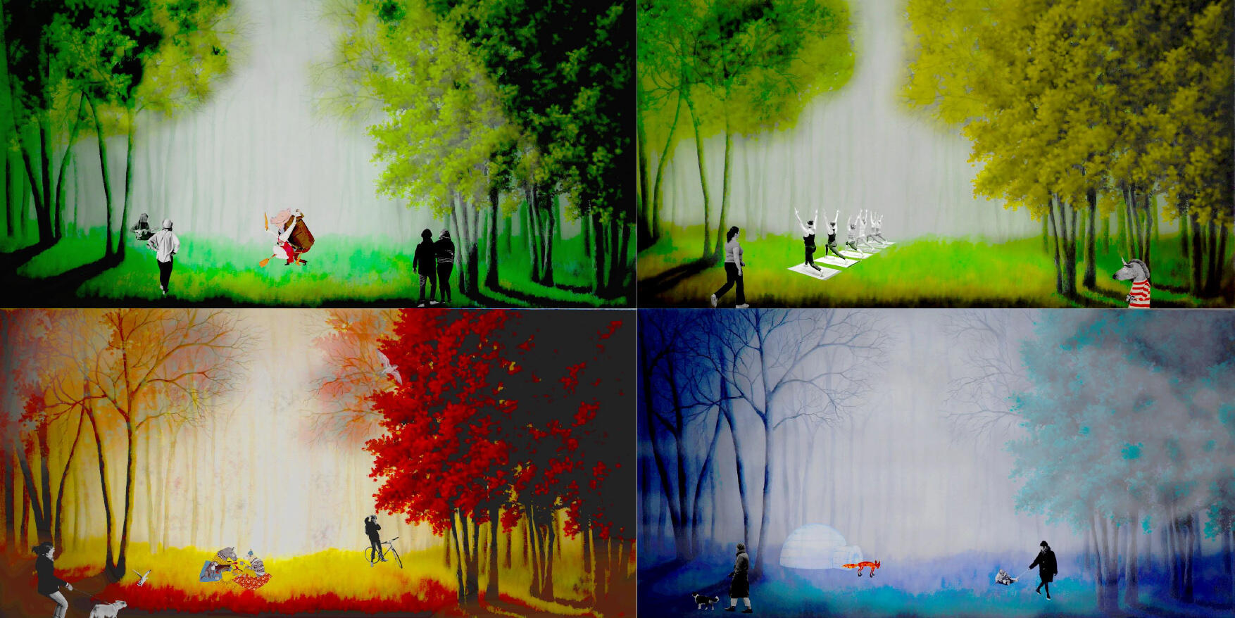 Lesní náměstí jsou slavnostní pokoje města ležící mimo jeho vystavěnou strukturu. V lesních náměstích je zakódovaný duch a historie samotného Radčického kopce: ovocné sady, stejně jako louky, dříve pastviny. Přírodní veřejné prostory jsou vestavěny do lesa tak, aby se v nich mohly odehrávat veselice, svatby, přednášky, představení, hostiny, soukromá pohoštění - život. Pracujeme s akupunkturami v krajině, které ji zpřístupňují, oživují a přibližují člověku, aniž by se musel nutně zříct komfortu městského života. Lesní náměstí a pěší cesty jsou pobytová místa v přírodě, která po svém návštěvníkovy nevyžadují, aby se oblékl do trekingového nebo sportovního oblečení, ale vítají ho i v civilu.